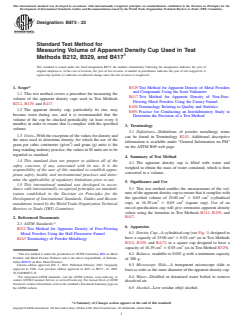 SIGNIFICANCE AND USE 5.1 This test method enables the measurement of the volume of the apparent density cup to ensure that it complies with the specified volume of 25.00 cm3 ± 0.03 cm3 (cylindrical cup), or 16.39 cm3 ± 0.05 cm3 (square cup). Use of an out-of-specification cup will give erroneous apparent density values using the formulae in Test Methods B212, B329, and B417. SCOPE 1.1 This test method covers a procedure for measuring the volume of the apparent density cups used in Test Methods B212, B329, and B417. 1.2 The apparent density cup, particularly its rim, may become worn during use, and it is recommended that the volume of the cup be checked periodically (at least every 6 months) in order to ensure that it complies with the specified volume. 1.3 Units—With the exception of the values for density and the mass used to determine density, for which the use of the gram per cubic centimetre (g/cm3) and gram (g) units is the long standing industry practice, the values in SI units are to be regarded as standard. 1.4 This standard does not purport to address all of the safety concerns, if any, associated with its use. It is the responsibility of the user of this standard to establish appropriate safety, health, and environmental practices and determine the applicability of regulatory limitations prior to use. 1.5 This international standard was developed in accordance with internationally recognized principles on standardization established in the Decision on Principles for the Development of International Standards, Guides and Recommendations issued by the World Trade Organization Technical Barriers to Trade (TBT) Committee.