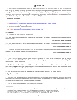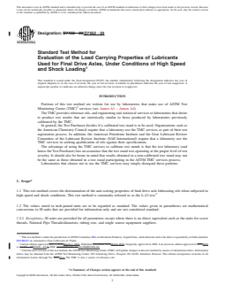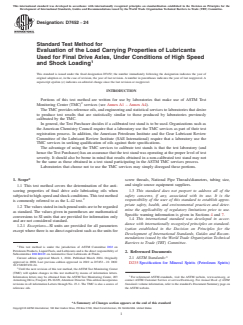 ASTM D7452-24 is a standard published by ASTM International. Its full title is "Standard Test Method for Evaluation of the Load Carrying Properties of Lubricants Used for Final Drive Axles, Under Conditions of High Speed and Shock Loading". This standard covers: SIGNIFICANCE AND USE 5.1 Final drive axles are often subjected to severe service where they encounter high speed shock torque conditions, characterized by sudden accelerations and decelerations. This severe service can lead to scoring distress on the ring gear and pinion surface. This test method measures anti-scoring properties of final drive lubricants. 5.2 This test method is used or referred to in the following documents: 5.2.1 American Petroleum Institute (API) Publication 1560.7 5.2.2 SAE J308 and SAE J2360. SCOPE 1.1 This test method covers the determination of the anti-scoring properties of final drive axle lubricating oils when subjected to high-speed and shock conditions. This test method is commonly referred to as the L-42 test.2 1.2 The values stated in inch-pound units are to be regarded as standard. The values given in parentheses are mathematical conversions to SI units that are provided for information only and are not considered standard. 1.2.1 Exceptions—SI units are provided for all parameters except where there is no direct equivalent such as the units for screw threads, National Pipe Threads/diameters, tubing size, and single source equipment suppliers. 1.3 This standard does not purport to address all of the safety concerns, if any, associated with its use. It is the responsibility of the user of this standard to establish appropriate safety, health, and environmental practices and determine the applicability of regulatory limitations prior to use. Specific warning information is given in Sections 4 and 7. 1.4 This international standard was developed in accordance with internationally recognized principles on standardization established in the Decision on Principles for the Development of International Standards, Guides and Recommendations issued by the World Trade Organization Technical Barriers to Trade (TBT) Committee.