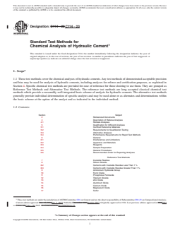 1.1 These test methods cover the chemical analyses of hydraulic cements. Any test methods of demonstrated acceptable precision and bias may be used for analysis of hydraulic cements, including analyses for referee and certification purposes, as explained in Section 4. Specific chemical test methods are provided for ease of reference for those desiring to use them. They are grouped as Reference Test Methods and Alternative Test Methods. The reference test methods are long accepted classical chemical test methods which provide a reasonably well-integrated basic scheme of analysis for hydraulic cements. The alternative test methods generally provide individual determination of specific analytes and may be used alone or as alternates and determinations within the basic scheme at the option of the analyst and as indicated in the individual method.