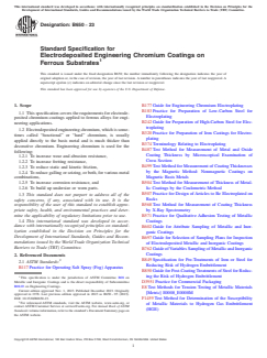 ASTM B650-23 is a technical specification published by ASTM International. Its full title is "Standard Specification for Electrodeposited Engineering Chromium Coatings on Ferrous Substrates". This standard covers: ABSTRACT This specification covers the requirements for electrodeposited chromium coatings (sometimes referred to as functional or hard chromium) applied to ferrous alloy substrates for engineering applications, particularly for increasing wear, abrasion, fretting, and corrosion resistance; for reducing galling or seizing, and static and kinetic friction; and for building up undersize or worn parts. Coatings shall be classified according to their thickness. Coatings shall be sampled, tested, and shall conform accordingly to specified requirements as to appearance, stress relief and hydrogen embrittlement treatment, thickness (to measured either by microscopical, magnetic, coulometric, or X-ray spectrometry method), adhesion (to be assessed either by bend, file, heat and quench, or push test), porosity (to be examined either by ferroxyl, neutral salt spray, or copper sulfate test), workmanship, and packaging. SCOPE 1.1 This specification covers the requirements for electrodeposited chromium coatings applied to ferrous alloys for engineering applications. 1.2 Electrodeposited engineering chromium, which is sometimes called “functional” or “hard” chromium, is usually applied directly to the basis metal and is much thicker than decorative chromium. Engineering chromium is used for the following: 1.2.1 To increase wear and abrasion resistance, 1.2.2 To increase fretting resistance, 1.2.3 To reduce static and kinetic friction, 1.2.4 To reduce galling or seizing, or both, for various metal combinations, 1.2.5 To increase corrosion resistance, and 1.2.6 To build up undersize or worn parts. 1.3 This standard does not purport to address all of the safety concerns, if any, associated with its use. It is the responsibility of the user of this standard to establish appropriate safety, health, and environmental practices and determine the applicability of regulatory limitations prior to use. 1.4 This international standard was developed in accordance with internationally recognized principles on standardization established in the Decision on Principles for the Development of International Standards, Guides and Recommendations issued by the World Trade Organization Technical Barriers to Trade (TBT) Committee.