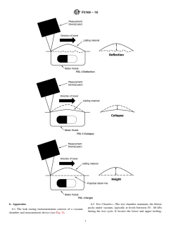 1.3 Test Results—Test results are reported qualitatively (pass/fail). Appropriate acceptance criteria for deflection, height, and collapse values are established by comparing non-leaking packs with those containing defects of a known size. Suitably sized defects in the laminate, tray material, and seal can be detected using this test method. The sensitivity of this test method depends upon a range of factors including blister pocket headspace, blister pocket size, lidding material type, lidding material thickness, lidding material tension, printing, surface texture, test conditions, and the values selected for the pass/fail acceptance criteria. The ability of the test to detect 15 µm, 50 µm, and catastrophic sized holes in four blister pack designs was demonstrated in a study.