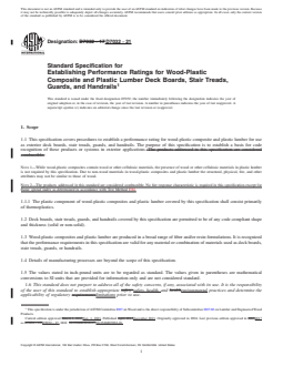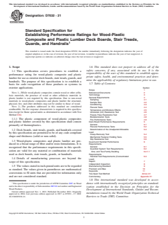 1.1 This specification covers procedures to establish a performance rating for wood-plastic composite and plastic lumber for use as exterior deck boards, stair treads, guards, and handrails. The purpose of this specification is to establish a basis for code recognition of these products or systems in exterior applications.