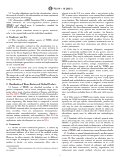 SIGNIFICANCE AND USE 4.1 This classification outlines aspects of TEMPs which includes their individual components. 4.2 The categories outlined in this classification are intended to list, identify, and group the areas pertinent to tissue-engineered medical products. This classification will be used by the Tissue-Engineered Medical Products subcommittees for the organization of the development of standards for the field of tissue engineering, TEMPs, and protocols for their use. The development of products from the new tissue engineering technologies necessitates creation and implementation of new standards (1).5 4.3 Since interactions may occur among the components used in TEMPs, new standard descriptions, test methods, and practices are needed to aid the evaluation of these interactions. The degree of overall risk for any given TEMP is reflected by the number and types of tests required to demonstrate product safety and efficacy. SCOPE 1.1 This classification outlines the aspects of tissue-engineered medical products that will be developed as standards. This classification excludes traditional transplantation of organs and tissues as well as transplantation of living cells alone as cellular therapies. 1.2 This classification does not apply to any medical products of human origin regulated by the U.S. Food and Drug Administration under 21 CFR Parts 16 and 1270 and 21 CFR Parts 207, 807, and 1271. 1.3 This standard does not purport to address specific components covered in other standards. Any safety areas associated with the medical product's use will not be addressed in this standard. This standard does not purport to address all of the safety concerns, if any, associated with its use. It is the responsibility of the user of this standard to establish appropriate safety, health, and environmental practices and determine the applicability of regulatory limitations prior to use. 1.4 This international standard was developed in accordance with internationally recognized principles on standardization established in the Decision on Principles for the Development of International Standards, Guides and Recommendations issued by the World Trade Organization Technical Barriers to Trade (TBT) Committee.
