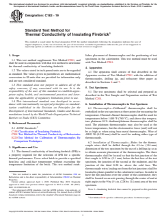 SIGNIFICANCE AND USE 3.1 The thermal conductivity of insulating firebrick (IFB) is a property required for the selection of IFB for a specific thermal performance. Users select brick to provide a specified heat-loss and cold-face temperature without exceeding the temperature limitation of the brick. This test method establishes placement of thermocouples and the positioning of test specimens in the calorimeter. This test method must be used with Test Method C201. SCOPE 1.1 This test method supplements Test Method C201, and shall be used in conjunction with that test method to determine the thermal conductivity of insulating firebrick. 1.2 The values stated in inch-pound units are to be regarded as standard. The values given in parentheses are mathematical conversions to SI units that are provided for information only and are not considered standard. 1.3 This standard does not purport to address all of the safety concerns, if any, associated with its use. It is the responsibility of the user of this standard to establish appropriate safety, health, and environmental practices and determine the applicability of regulatory limitations prior to use. 1.4 This international standard was developed in accordance with internationally recognized principles on standardization established in the Decision on Principles for the Development of International Standards, Guides and Recommendations issued by the World Trade Organization Technical Barriers to Trade (TBT) Committee.