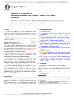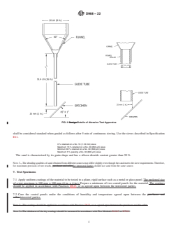 ASTM D968-22 is a standard published by ASTM International. Its full title is "Standard Test Methods for Abrasion Resistance of Organic Coatings by Falling Abrasive". This standard covers: SIGNIFICANCE AND USE 5.1 Silica sand produces a slower rate of abrasion for organic coatings than that provided by silicon carbide. For some types of coatings, it may also provide greater differentiation. 5.2 The abrasion resistance scales produced by the two methods differ, but the methods provide approximately the same rankings of coatings for abrasion resistance. 5.3 Each of the methods has been found useful for rating the abrasion resistance of specific types of coatings. For example Method A (falling sand) has been used for rating floor coatings while Method B (falling silicon carbide) has been used for rating coatings for ship decks. FIG. 1 Abrasion Test Apparatus SCOPE 1.1 These test methods cover the determination of the resistance of organic coatings to abrasion produced by abrasive falling onto coatings applied to a plane rigid surface, such as a metal or glass panel. 1.2 Two test methods based on different abrasives are covered as follows: Sections Method A—Falling Sand Abrasion Test 6 – 13 Method B—Falling Silicon Carbide Abrasion Test 14 – 21 1.3 These methods should be restricted to testing in only one laboratory when numerical values are used because of the poor reproducibility of the methods (see 13.1.2 and 21.1.2). Interlaboratory agreement is improved significantly when ranking is used in place of numerical values. 1.4 The values stated in SI units are to be regarded as the standard. The values given in parentheses after SI units are for information only and are not considered standard. 1.5 This standard does not purport to address all of the safety concerns, if any, associated with its use. It is the responsibility of the user of this standard to establish appropriate safety, health, and environmental practices and determine the applicability of regulatory limitations prior to use. 1.6 This international standard was developed in accordance with internationally recognized principles on standardization established in the Decision on Principles for the Development of International Standards, Guides and Recommendations issued by the World Trade Organization Technical Barriers to Trade (TBT) Committee.