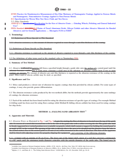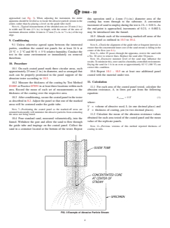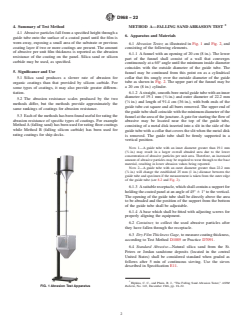 SIGNIFICANCE AND USE 5.1 Silica sand produces a slower rate of abrasion for organic coatings than that provided by silicon carbide. For some types of coatings, it may also provide greater differentiation. 5.2 The abrasion resistance scales produced by the two methods differ, but the methods provide approximately the same rankings of coatings for abrasion resistance. 5.3 Each of the methods has been found useful for rating the abrasion resistance of specific types of coatings. For example Method A (falling sand) has been used for rating floor coatings while Method B (falling silicon carbide) has been used for rating coatings for ship decks. FIG. 1 Abrasion Test Apparatus SCOPE 1.1 These test methods cover the determination of the resistance of organic coatings to abrasion produced by abrasive falling onto coatings applied to a plane rigid surface, such as a metal or glass panel. 1.2 Two test methods based on different abrasives are covered as follows: Sections Method A—Falling Sand Abrasion Test 6 – 13 Method B—Falling Silicon Carbide Abrasion Test 14 – 21 1.3 These methods should be restricted to testing in only one laboratory when numerical values are used because of the poor reproducibility of the methods (see 13.1.2 and 21.1.2). Interlaboratory agreement is improved significantly when ranking is used in place of numerical values. 1.4 The values stated in SI units are to be regarded as the standard. The values given in parentheses after SI units are for information only and are not considered standard. 1.5 This standard does not purport to address all of the safety concerns, if any, associated with its use. It is the responsibility of the user of this standard to establish appropriate safety, health, and environmental practices and determine the applicability of regulatory limitations prior to use. 1.6 This international standard was developed in accordance with internationally recognized principles on standardization established in the Decision on Principles for the Development of International Standards, Guides and Recommendations issued by the World Trade Organization Technical Barriers to Trade (TBT) Committee.