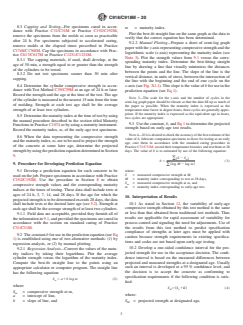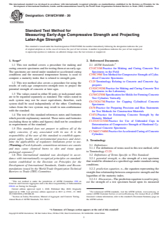 ASTM C918/C918M-20 is a standard published by ASTM International. Its full title is "Standard Test Method for Measuring Early-Age Compressive Strength and Projecting Later-Age Strength". This standard covers: SIGNIFICANCE AND USE 5.1 This test method provides a procedure to estimate the potential strength of a particular test specimen based upon its measured strength at an age as early as 24 h.4 The early-age test results provide information on the variability of the concrete production process for use in process control. 5.2 The relationship between early-age strength of test specimens and strength achieved at some later age under standard curing depends upon the materials comprising the concrete. In this test method, it is assumed that there is a linear relationship between strength and the logarithm of the maturity index. Experience has shown that this is an acceptable approximation for test ages between 24 h and 28 days under standard curing conditions. The user of this test method shall verify that the test data used to develop the prediction equation are represented correctly by the linear relationship. If the underlying relationship between strength and the logarithm of the maturity index cannot be approximated by a straight line, the principle of this test method is applicable provided an appropriate equation is used to represent the non-linear relationship. 5.3 Strength projections are limited to concretes using the same materials and proportions as the concrete used to establish the prediction equation. Note 1: Confidence intervals developed in accordance with 10.2 are helpful in evaluating projected strengths. 5.4 This test method is not intended for estimating the in-place strength of concrete. Practice C1074 provides procedures for using the measured in-place maturity index to estimate in-place strength. SCOPE 1.1 This test method covers a procedure for making and curing concrete specimens and for testing them at an early age. The specimens are stored under standard or accelerated curing conditions and the measured temperature history is used to compute a maturity index that is related to strength gain. 1.2 This test method also covers a procedure for using the results of early-age compressive-strength tests to project the potential strength of concrete at later ages. 1.3 The values stated in either SI units or inch-pound units are to be regarded separately as standard. The values stated in each system may not be exact equivalents; therefore, each system shall be used independently of the other. Combining values from the two systems may result in non-conformance with the standard. 1.4 The text of this standard references notes and footnotes which provide explanatory material. These notes and footnotes (excluding those in tables and figures) shall not be considered as requirements of the standard. 1.5 This standard does not purport to address all of the safety concerns, if any, associated with its use. It is the responsibility of the user of this standard to establish appropriate safety, health, and environmental practices and determine the applicability of regulatory limitations prior to use. (Warning—Fresh hydraulic cementitious mixtures are caustic and may cause chemical burns to skin and tissue upon prolonged exposure.)2 1.6 This international standard was developed in accordance with internationally recognized principles on standardization established in the Decision on Principles for the Development of International Standards, Guides and Recommendations issued by the World Trade Organization Technical Barriers to Trade (TBT) Committee.