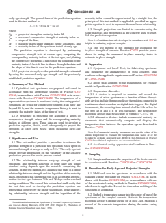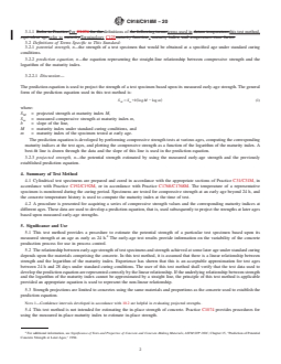 SIGNIFICANCE AND USE 5.1 This test method provides a procedure to estimate the potential strength of a particular test specimen based upon its measured strength at an age as early as 24 h.4 The early-age test results provide information on the variability of the concrete production process for use in process control. 5.2 The relationship between early-age strength of test specimens and strength achieved at some later age under standard curing depends upon the materials comprising the concrete. In this test method, it is assumed that there is a linear relationship between strength and the logarithm of the maturity index. Experience has shown that this is an acceptable approximation for test ages between 24 h and 28 days under standard curing conditions. The user of this test method shall verify that the test data used to develop the prediction equation are represented correctly by the linear relationship. If the underlying relationship between strength and the logarithm of the maturity index cannot be approximated by a straight line, the principle of this test method is applicable provided an appropriate equation is used to represent the non-linear relationship. 5.3 Strength projections are limited to concretes using the same materials and proportions as the concrete used to establish the prediction equation. Note 1: Confidence intervals developed in accordance with 10.2 are helpful in evaluating projected strengths. 5.4 This test method is not intended for estimating the in-place strength of concrete. Practice C1074 provides procedures for using the measured in-place maturity index to estimate in-place strength. SCOPE 1.1 This test method covers a procedure for making and curing concrete specimens and for testing them at an early age. The specimens are stored under standard or accelerated curing conditions and the measured temperature history is used to compute a maturity index that is related to strength gain. 1.2 This test method also covers a procedure for using the results of early-age compressive-strength tests to project the potential strength of concrete at later ages. 1.3 The values stated in either SI units or inch-pound units are to be regarded separately as standard. The values stated in each system may not be exact equivalents; therefore, each system shall be used independently of the other. Combining values from the two systems may result in non-conformance with the standard. 1.4 The text of this standard references notes and footnotes which provide explanatory material. These notes and footnotes (excluding those in tables and figures) shall not be considered as requirements of the standard. 1.5 This standard does not purport to address all of the safety concerns, if any, associated with its use. It is the responsibility of the user of this standard to establish appropriate safety, health, and environmental practices and determine the applicability of regulatory limitations prior to use. (Warning—Fresh hydraulic cementitious mixtures are caustic and may cause chemical burns to skin and tissue upon prolonged exposure.)2 1.6 This international standard was developed in accordance with internationally recognized principles on standardization established in the Decision on Principles for the Development of International Standards, Guides and Recommendations issued by the World Trade Organization Technical Barriers to Trade (TBT) Committee.