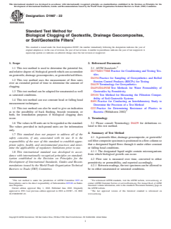 ASTM D1987-22 is a standard published by ASTM International. Its full title is "Standard Test Method for Biological Clogging of Geotextile, Drainage Geocomposites, or Soil/Geotextile Filters". This standard covers: SIGNIFICANCE AND USE 5.1 This test method is performance oriented for determining if, and to what degree, different liquids create biological activity on geotextile filters thereby reducing their flow capability. The use of the method is primarily oriented toward landfill leachates but can be performed with any liquid coming from a particular site or synthesized from a predetermined mixture of biological microorganisms. 5.2 The test can be used to compare the flow capability of different types of geotextiles, drainage geocomposite, or soil/geotextile combinations. 5.3 This test will usually take considerable time, for example, up to 1000 h, for the biological activity to initiate, grow, and reach an equilibrium condition. The curves resulting from the test are intended to indicate the in-situ behavior of a geotextile or soil/geotextile filter. 5.4 The test specimen can be incubated under unsaturated drained conditions between readings, or kept saturated at all times. The first case allows for air penetration into the flow column and thus aerobic conditions. The second case can result in the absence of air; thus it may simulate anaerobic conditions. 5.5 The flow rate can be determined using either a constant head test procedure or on the basis of a falling head test procedure. In either case, the flow column containing the geotextile or soil/geotextile is the same; only the head control devices change. Note 1: It has been found that once biological clogging initiates, constant head tests often pass inadequate quantities of liquid to accurately measure. It thus becomes necessary to use falling head tests, which can be measured based on time of movement of a relatively small quantity of liquid between two designated points on a clear plastic standpipe. 5.6 If the establishment of an unacceptably high degree of clogging is seen in the flow rate curves, the device allows for back flushing with water or with water containing a biocide. 5.7 The resulting flow rate curves ar... SCOPE 1.1 This test method is used to determine the potential for, and relative degree of, biological growth which can accumulate on geotextile, drainage geocomposites, or geotextile/soil filters. 1.2 This test method uses the measurement of flow rates over an extended period of time to determine the amount of clogging. 1.3 This test method can be adapted for unsaturated as well as saturated conditions. 1.4 This test method can use constant head or falling head measurement techniques. 1.5 This test method can also be used to give an indication as to the possibility of back flushing, biocide treatment, or both, for remediation purposes if biological clogging does occur. 1.6 The values in SI units are to be regarded as the standard. The values provided in inch-pound units are for information only. 1.7 This standard does not purport to address all of the safety concerns, if any, associated with its use. It is the responsibility of the user of this standard to establish appropriate safety, health, and environmental practices and determine the applicability of regulatory limitations prior to use. 1.8 This international standard was developed in accordance with internationally recognized principles on standardization established in the Decision on Principles for the Development of International Standards, Guides and Recommendations issued by the World Trade Organization Technical Barriers to Trade (TBT) Committee.