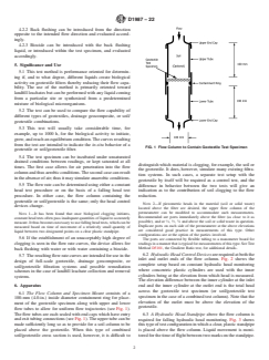 SIGNIFICANCE AND USE 5.1 This test method is performance oriented for determining if, and to what degree, different liquids create biological activity on geotextile filters thereby reducing their flow capability. The use of the method is primarily oriented toward landfill leachates but can be performed with any liquid coming from a particular site or synthesized from a predetermined mixture of biological microorganisms. 5.2 The test can be used to compare the flow capability of different types of geotextiles, drainage geocomposite, or soil/geotextile combinations. 5.3 This test will usually take considerable time, for example, up to 1000 h, for the biological activity to initiate, grow, and reach an equilibrium condition. The curves resulting from the test are intended to indicate the in-situ behavior of a geotextile or soil/geotextile filter. 5.4 The test specimen can be incubated under unsaturated drained conditions between readings, or kept saturated at all times. The first case allows for air penetration into the flow column and thus aerobic conditions. The second case can result in the absence of air; thus it may simulate anaerobic conditions. 5.5 The flow rate can be determined using either a constant head test procedure or on the basis of a falling head test procedure. In either case, the flow column containing the geotextile or soil/geotextile is the same; only the head control devices change. Note 1: It has been found that once biological clogging initiates, constant head tests often pass inadequate quantities of liquid to accurately measure. It thus becomes necessary to use falling head tests, which can be measured based on time of movement of a relatively small quantity of liquid between two designated points on a clear plastic standpipe. 5.6 If the establishment of an unacceptably high degree of clogging is seen in the flow rate curves, the device allows for back flushing with water or with water containing a biocide. 5.7 The resulting flow rate curves ar... SCOPE 1.1 This test method is used to determine the potential for, and relative degree of, biological growth which can accumulate on geotextile, drainage geocomposites, or geotextile/soil filters. 1.2 This test method uses the measurement of flow rates over an extended period of time to determine the amount of clogging. 1.3 This test method can be adapted for unsaturated as well as saturated conditions. 1.4 This test method can use constant head or falling head measurement techniques. 1.5 This test method can also be used to give an indication as to the possibility of back flushing, biocide treatment, or both, for remediation purposes if biological clogging does occur. 1.6 The values in SI units are to be regarded as the standard. The values provided in inch-pound units are for information only. 1.7 This standard does not purport to address all of the safety concerns, if any, associated with its use. It is the responsibility of the user of this standard to establish appropriate safety, health, and environmental practices and determine the applicability of regulatory limitations prior to use. 1.8 This international standard was developed in accordance with internationally recognized principles on standardization established in the Decision on Principles for the Development of International Standards, Guides and Recommendations issued by the World Trade Organization Technical Barriers to Trade (TBT) Committee.