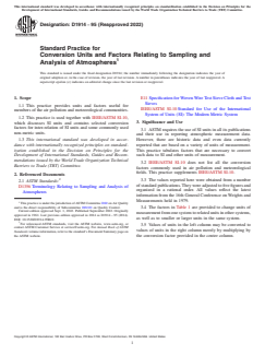 ASTM D1914-95(2022) is a standard published by ASTM International. Its full title is "Standard Practice for Conversion Units and Factors Relating to Sampling and Analysis of Atmospheres". This standard covers: SIGNIFICANCE AND USE 3.1 ASTM requires the use of SI units in all its publications and their use in reporting atmospheric measurement data. However, there are historic data and even data currently reported that are based on a variety of units of measurement. This practice tabulates factors that are necessary to convert such data to SI and other units of measurement. 3.2 IEEE/ASTM SI-10 does not list all the conversion factors commonly used in air pollution and meteorological fields. This practice supplements IEEE/ASTM SI-10. 3.3 The values reported here were obtained from a number of standard publications. They were adjusted to five figures and organized in a rational order. All values reflect the latest information from the 16th General Conference on Weights and Measurements held in 1979. 3.4 The factors in Table 1 are provided to change units of measurement from one system to related units in other systems, as well as to smaller or larger units in the same system. 3.5 Values of units in the left column may be converted to values of units in the right column merely by multiplying by the conversion factor provided in the center column. (A) For specific applications and exceptions, see Terminology D1356. SCOPE 1.1 This practice provides units and factors useful for members of the air pollution and meteorological communities. 1.2 This practice is used together with IEEE/ASTM SI-10, which discusses SI units and contains selected conversion factors for inter-relation of SI units and some commonly used non-metric units. 1.3 This international standard was developed in accordance with internationally recognized principles on standardization established in the Decision on Principles for the Development of International Standards, Guides and Recommendations issued by the World Trade Organization Technical Barriers to Trade (TBT) Committee.