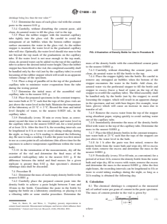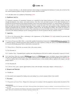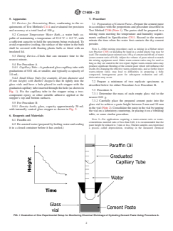 SIGNIFICANCE AND USE 4.1 Numerous properties of cementitious materials are controlled by their initial hydration rate. Examples include early-age strength development, heat release, and crack resistance. One direct and convenient measure of this initial hydration rate is provided by the measurement of the chemical shrinkage of the cement paste during its hydration. As cement hydrates, the hydration products occupy less volume than the initial reacting materials (cement and water). Due to this volume change, a hydrating cement paste will sorb water from its immediate surroundings, when available. At early times, this sorption is in direct proportion to the amount of hydration that has occurred.5 This method is based on the one developed by Geiker.6 The results are relevant to understanding the hydration behavior of cements. This method does not measure the bulk volume changes (autogenous shrinkage) associated with chemical shrinkage nor the cracking potential of concretes produced with the evaluated cement. SCOPE 1.1 This test method measures the internal (absolute) volume change of hydraulic cement paste that results from the hydration of the cementitious materials. This volume change is known as chemical shrinkage. 1.1.1 Procedure A, volumetric method. 1.1.2 Procedure B, the density method. 1.2 The values stated in SI units are to be regarded as the standard. 1.3 This standard does not purport to address all of the safety concerns, if any, associated with its use. It is the responsibility of the user of this standard to establish appropriate safety, health, and environmental practices and determine the applicability of regulatory limitations prior to use. (Warning—Fresh hydraulic cementitious mixtures are caustic and may cause chemical burns to skin and tissue upon prolonged exposure.2) 1.4 This international standard was developed in accordance with internationally recognized principles on standardization established in the Decision on Principles for the Development of International Standards, Guides and Recommendations issued by the World Trade Organization Technical Barriers to Trade (TBT) Committee.