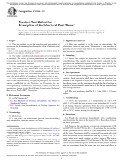 SIGNIFICANCE AND USE 4.1 This test method is to be used in determining the absorption value of cast stone. Absorption is one measure of porosity of cast stone and, hence, its resistance to weathering and in-service durability. SCOPE 1.1 This test method covers the sampling and preparation of specimens for determining the absorption value of architectural cast stone. Note 1: The testing laboratory performing this test method should be evaluated in accordance with Practice C1093. 1.2 The values stated in inch-pound units are to be regarded as standard. The values given in parentheses are mathematical conversions to SI units that are provided for information only and are not considered standard. 1.3 This standard does not purport to address all of the safety concerns, if any, associated with its use. It is the responsibility of the user of this standard to establish appropriate safety, health, and environmental practices and determine the applicability of regulatory limitations prior to use. 1.4 This international standard was developed in accordance with internationally recognized principles on standardization established in the Decision on Principles for the Development of International Standards, Guides and Recommendations issued by the World Trade Organization Technical Barriers to Trade (TBT) Committee.