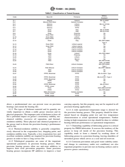 SIGNIFICANCE AND USE 4.1 The purpose of this guide is to report on the testing of, to discuss and compare the properties of, and to provide guidelines for the choice of lubricating greases for precision rolling element bearings (PREB). The PREB are, for the purposes of this guide, meant to include bearings of Annular Bearing Engineer's Committee (ABEC) 5 quality and above. This guide limits its scope to lubricating greases used in PREB. 4.2 The number of lubricating greases used in PREB increased dramatically from the early 1940s to the mid 1990s. In the beginning of this period, petroleum products were the only widely available base stocks. Later, synthetic base oils became available. They included synthetic hydrocarbons, esters, silicones, multiply alkylated cyclopentanes (MAC) and fluorinated materials, including perfluorinated ethers and the fluorosilicones. This broad spectrum of lubricant choices has led to the use of a large number of different lubricants in PREB applications. The U.S. Department of Defense, as a user of many PREB, has seen a significant increase in the logistics effort required to support the procurement and distribution of these items. In addition, as time has passed, some of the greases used in certain PREB are no longer available or require improved performances due to advanced bearing technology/requirements. This implies that replacement lubricating greases must be found, especially in this era of extending the lifetime of DoD assets, with the consequent and unprojected demand for sources of replacement parts. 4.3 One of the primary goals of this study was to take a broad spectrum of the lubricating greases used in PREB and do a comprehensive series of tests on them in order that their properties could be compared and, if necessary, potential replacement greases be identified. This study is also meant to be a design guide for choosing lubricating greases for future PREB applications. This guide represents a collective effort of many members of this co... SCOPE 1.1 This guide is a tool to aid in the choice of lubricating grease for precision rolling element bearing applications. The recommendations in this guide are not intended for general purpose bearing applications There are two areas where this guide should have the greatest impact: (1) when lubricating grease is being chosen for a new bearing application and (2) when grease for a bearing has to be replaced because the original grease specified for the bearing can no longer be obtained. The Report (see Section 5) contains a series of tests on a wide variety of greases commonly used in bearing applications to allow comparisons of those properties of the grease that the committee thought to be most important when making a choice of lubricating grease. Each test was performed by the same laboratory. This guide contains a listing of the properties of greases by base oil type, that is, ester, perfluoropolyether (PFPE), polyalphaolefin (PAO), and so forth. This organization is necessary since the operational requirements in a particular bearing application may limit the choice of grease to a particular base oil type and thickener due to its temperature stability, viscosity index or temperature-vapor pressure characteristics, etc. The guide provides data to assist the user in selecting replacement greases for those greases tested that are no longer available. The guide also includes a glossary of terms used in describing/discussing the lubrication of precision and instrument bearings. 1.2 The lubricating greases presented in this guide are commonly used in precision rolling element bearings (PREB). These greases were selected for the testing based on the grease survey obtained from DoD, OEM and grease manufactures and evaluated according to the test protocol that was designed by Subcommittee F34 on Tribology. This test protocol covers the essential requirements identified for precision bearing greases. The performance requirem...