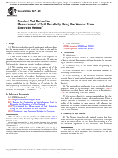ASTM G57-20 is a standard published by ASTM International. Its full title is "Standard Test Method for Measurement of Soil Resistivity Using the Wenner Four-Electrode Method". This standard covers: SIGNIFICANCE AND USE 5.1 Measurement of soil resistivity is used for assessment and control of corrosion of buried structures. Soil resistivity is used both for the estimation of expected corrosion rates and for the design of cathodic protection systems. As an essential design parameter for cathodic protection systems, it is important to take as many measurements as necessary so as to get a sufficiently representative characterization of the soil environment to which the entire buried structure will be exposed. SCOPE 1.1 This test method covers the equipment and procedures for the measurement of soil resistivity, both in situ and for samples removed from the ground, for use in assessment and control of corrosion of buried structures. 1.2 The values stated in SI units are to be regarded as standard. The values given in parentheses after SI units are provided for information only and are not considered standard. Soil resistivity values are reported in ohm-centimeter. 1.3 This standard does not purport to address all of the safety concerns, if any, associated with its use. It is the responsibility of the user of this standard to establish appropriate safety, health, and environmental practices and determine the applicability of regulatory limitations prior to use. 1.4 This international standard was developed in accordance with internationally recognized principles on standardization established in the Decision on Principles for the Development of International Standards, Guides and Recommendations issued by the World Trade Organization Technical Barriers to Trade (TBT) Committee.