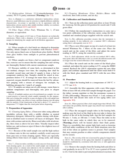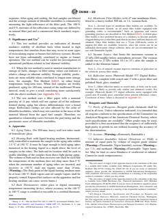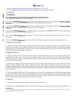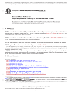 SIGNIFICANCE AND USE 5.1 This test method provides an indication of thermal oxidative stability of distillate fuels when heated to high temperatures that simulate those that may occur in some types of recirculating engine or burner fuel delivery systems. Results have not been substantially correlated to engine or burner operation. The test method can be useful for investigation of operational problems related to fuel thermal stability. 5.2 When the test method is used to monitor manufacture or storage of fuels, changes in filter rating values can indicate a relative change in inherent stability. Storage stability predictions are more reliable when correlated to longer-term storage tests, for example, Test Method D4625, or other lower temperature, long-term tests. When fuel samples are freshly produced, aging for 180 min, instead of the traditional 90 min interval, tends to give a result correlating more satisfactorily with the above methods (see Appendix X2). 5.3 The test method uses a filter paper with a nominal porosity of 11 μm, which will not capture all of the sediment formed during aging but allows differentiation over a broad range. Reflectance ratings are also affected by the color of filterable insolubles, which may not correlate to the mass of the material filtered from the aged fuel sample. Therefore, no quantitative relationship exists between the pad rating and the gravimetric mass of filterable insolubles. SCOPE 1.1 This test method covers relative stability of middle distillate fuels under high temperature aging conditions with limited air exposure. This test method is suitable for all No. 1 and No. 2 grades in Specifications D396, D975, D2880, and D3699. It is also suitable for similar fuels meeting other specifications. 1.2 This test method is not suitable for fuels whose flash point, as determined by Test Methods D56, D93, or D3828, is less than 38 °C. This test method is not suitable for fuels containing residual oil. 1.3 The values stated in SI units are to be regarded as standard. No other units of measurement are included in this standard. 1.3.1 Exception—The maximum vacuum includes inch-pound units in 6.5 and 11.2. 1.4 This standard does not purport to address all of the safety concerns, if any, associated with its use. It is the responsibility of the user of this standard to establish appropriate safety, health, and environmental practices and determine the applicability of regulatory limitations prior to use. 1.5 This international standard was developed in accordance with internationally recognized principles on standardization established in the Decision on Principles for the Development of International Standards, Guides and Recommendations issued by the World Trade Organization Technical Barriers to Trade (TBT) Committee.