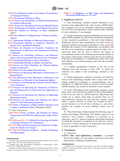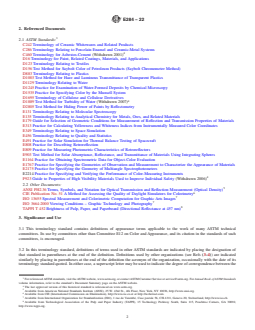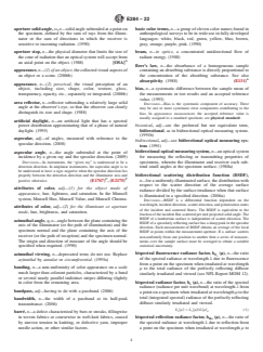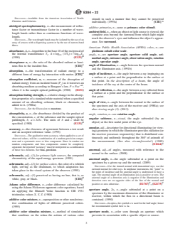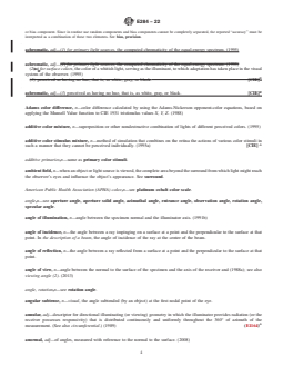 SIGNIFICANCE AND USE 3.1 This terminology standard contains definitions of appearance terms applicable to the work of many ASTM technical committees. Its use by committees other than Committee E12 on Color and Appearance, and its citation in the standards of such committees, is encouraged. 3.2 In this terminology standard, definitions of terms used in other ASTM standards are indicated by placing the designation of that standard in parentheses at the end of the definition. Definitions used by other organizations (see Refs (3–4)) are indicated similarly by placing in parentheses at the end of the definition the acronym of the organization, occasionally with the date of its terminology standard quoted. In either case, a superscript letter may be used to indicate the degree of correspondence between the definition given herein and that in the citation. Superscript A indicates that the two are identical; B that the given definition is a modification of that cited, with little difference in essential meaning; and C that the two differ substantially. 3.3 A further parenthetical inclusion at the end of the definition gives the revision, if after 1981, in which the definition was added to this terminology standard or last revised. 3.4 Where appropriate, symbols or acronyms are listed for terms in this terminology standard. Since usage varies, these listings should be considered as recommendations, not as mandatory. If a different symbol or acronym is used in another ASTM standard, this should be indicated in that standard. 3.5 In the 1990 edition of this terminology standard, a great many terms were relocated to conform to the recommendation of the Form and Style for ASTM Standards, (Blue Book) that listings be in spoken word order. In general, there are no cross-references between the old and new listings, except where a special function is served. An example of such a special function is to list all terms relating to a given basic quantity, for example, all terms defining various ... SCOPE 1.1 This terminology standard defines terms used in the description of appearance, including but not limited to color, gloss, opacity, scattering, texture, and visibility of both materials (ordinary, fluorescent, retroreflective) and light sources (including visual display units). 1.2 It is the policy of ASTM Committee E12 on Color and Appearance that this terminology standard include important terms and definitions explicit to the scope, whether or not the terms are currently used in an ASTM standard. Terms that are in common use and appear in common-language dictionaries (see Refs (1–2)2) are generally not included, except when the dictionaries show multiple definitions and it seems desirable to indicate the definitions recommended for E12 standards. 1.3 The usage of terms describing appearance varies considerably. In some cases, different usage of a term in different fields has been noted. 1.4 This international standard was developed in accordance with internationally recognized principles on standardization established in the Decision on Principles for the Development of International Standards, Guides and Recommendations issued by the World Trade Organization Technical Barriers to Trade (TBT) Committee.