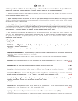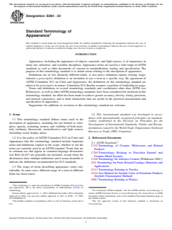 ASTM E284-22 is a standard published by ASTM International. Its full title is "Standard Terminology of Appearance". This standard covers: SIGNIFICANCE AND USE 3.1 This terminology standard contains definitions of appearance terms applicable to the work of many ASTM technical committees. Its use by committees other than Committee E12 on Color and Appearance, and its citation in the standards of such committees, is encouraged. 3.2 In this terminology standard, definitions of terms used in other ASTM standards are indicated by placing the designation of that standard in parentheses at the end of the definition. Definitions used by other organizations (see Refs (3–4)) are indicated similarly by placing in parentheses at the end of the definition the acronym of the organization, occasionally with the date of its terminology standard quoted. In either case, a superscript letter may be used to indicate the degree of correspondence between the definition given herein and that in the citation. Superscript A indicates that the two are identical; B that the given definition is a modification of that cited, with little difference in essential meaning; and C that the two differ substantially. 3.3 A further parenthetical inclusion at the end of the definition gives the revision, if after 1981, in which the definition was added to this terminology standard or last revised. 3.4 Where appropriate, symbols or acronyms are listed for terms in this terminology standard. Since usage varies, these listings should be considered as recommendations, not as mandatory. If a different symbol or acronym is used in another ASTM standard, this should be indicated in that standard. 3.5 In the 1990 edition of this terminology standard, a great many terms were relocated to conform to the recommendation of the Form and Style for ASTM Standards, (Blue Book) that listings be in spoken word order. In general, there are no cross-references between the old and new listings, except where a special function is served. An example of such a special function is to list all terms relating to a given basic quantity, for example, all terms defining various ... SCOPE 1.1 This terminology standard defines terms used in the description of appearance, including but not limited to color, gloss, opacity, scattering, texture, and visibility of both materials (ordinary, fluorescent, retroreflective) and light sources (including visual display units). 1.2 It is the policy of ASTM Committee E12 on Color and Appearance that this terminology standard include important terms and definitions explicit to the scope, whether or not the terms are currently used in an ASTM standard. Terms that are in common use and appear in common-language dictionaries (see Refs (1–2)2) are generally not included, except when the dictionaries show multiple definitions and it seems desirable to indicate the definitions recommended for E12 standards. 1.3 The usage of terms describing appearance varies considerably. In some cases, different usage of a term in different fields has been noted. 1.4 This international standard was developed in accordance with internationally recognized principles on standardization established in the Decision on Principles for the Development of International Standards, Guides and Recommendations issued by the World Trade Organization Technical Barriers to Trade (TBT) Committee.