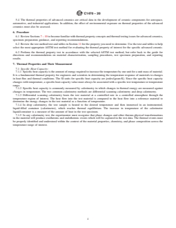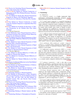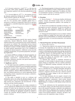 SIGNIFICANCE AND USE 5.1 The high-temperature capabilities of advanced ceramics are a key performance benefit for many demanding engineering applications. In many of those applications, advanced ceramics will have to perform across a broad temperature range. The thermal expansion, thermal diffusivity/conductivity, specific heat, and emittance/emissivity are crucial engineering factors in integrating ceramic components into aerospace, automotive, and industrial systems. 5.2 This guide is intended to serve as a reference and information source for testing the thermal properties of advanced ceramics, based on an understanding of the relationships between the composition and microstructure of these materials and their thermal properties. 5.3 The use of this guide assists the testing community in correctly applying the ASTM thermal test methods to advanced ceramics to ensure that the thermal test results are properly measured, interpreted, and understood. This guide also assists the user in selecting the appropriate thermal test method to evaluate the particular thermal properties of the advanced ceramic of interest. 5.4 The thermal properties of advanced ceramics are critical data in the development of ceramic components for aerospace, automotive, and industrial applications. In addition, the effect of environmental exposure on thermal properties of the advanced ceramics must also be assessed. SCOPE 1.1 This guide covers the thermal property testing of advanced ceramics, to include monolithic ceramics, particulate/ whisker-reinforced ceramics, and continuous fiber-reinforced ceramic composites. It is intended to provide guidance and information to users on the special considerations involved in determining the thermal properties of these ceramic materials. 1.2 Five thermal properties (specific heat capacity, thermal conductivity, thermal diffusivity, thermal expansion, and emittance/emissivity) are presented in terms of their definitions and general test methods. The relationship between thermal properties and the composition, microstructure, and processing of advanced ceramics (monolithic and composite) is briefly outlined, providing guidance on which material and specimen characteristics have to be considered in evaluating the thermal properties of advanced ceramics. Additional sections describe sampling considerations, test specimen preparation, and reporting requirements. 1.3 Current ASTM test methods for thermal properties are tabulated in terms of test method concept, testing range, specimen requirements, standards/reference materials, capabilities, limitations, precision, and special instructions for monolithic and composite ceramics. 1.4 This guide is based on the use of current ASTM standards for thermal properties, where appropriate, and on the development of new test standards, where necessary. It is not the intent of this guide to rigidly specify particular thermal test methods for advanced ceramics. Guidance is provided on how to utilize the most commonly available ASTM thermal test methods, considering their capabilities and limitations. 1.5 The values stated in SI units are to be regarded as standard. No other units of measurement are included in this standard. See IEEE/ASTM SI 10. 1.6 This standard does not purport to address all of the safety concerns, if any, associated with its use. It is the responsibility of the user of this standard to establish appropriate safety, health, and environmental practices and determine the applicability of regulatory limitations prior to use. 1.7 This international standard was developed in accordance with internationally recognized principles on standardization established in the Decision on Principles for the Development of International Standards, Guides and Recommendations issued by the World Trade Organization Technical Barriers to Trade (TBT) Committee.