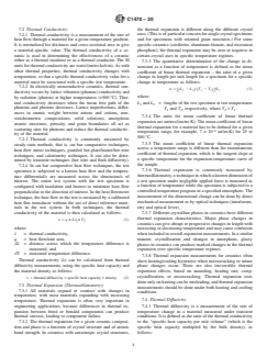 1.3 Current ASTM test methods for thermal properties are tabulated in terms of test method concept, testing range, specimen requirements, standards/reference materials, capabilities, limitations, precision, and special instructions for monolithic and composite ceramics.