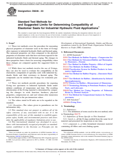 SIGNIFICANCE AND USE 4.1 When more than one elastomer seal material is tested, the test methods yield comparative data on which to base judgements as to expected service quality. Suggested in-service property change limits are provided. Property changes beyond these limits will indicate limited service life of the elastomer seal. 4.2 These test methods attempt to simulate service conditions through controlled aging and evaluation of property changes but may not give any direct correlations with actual part performance since actual service conditions vary widely. These test methods yield comparative data and indications of property changes of the elastomeric seal material under ideal service conditions. These test methods can be used for quality control purposes, for engineering assessments, for service evaluation, and for manufacturing control. The information from these test methods can be used to anticipate expected service quality. SCOPE 1.1 These test methods cover the procedure for measuring physical properties of elastomer seals in the form of O-rings after exposure to industrial hydraulic fluids and thermal aging. The measured properties are then compared to the physical properties of elastomer seals that have not been exposed to the industrial hydraulic fluids and thermal aging. The changes in these properties form a basis for assessing compatibility when these changes are compared against the suggested limits in Table 1. 1.2 While these test methods involve the use of O-rings, they can also be used to evaluate the compatibility of the elastomeric compounds of specialty seals with industrial hydraulic fluids and their resistance to thermal aging. The compounds can be molded into O-rings for evaluation purposes. 1.3 These test methods provide procedures for exposing O-ring test specimens to industrial hydraulic fluids under definite conditions of temperature and time. The resulting deterioration of the O-ring material is determined by comparing the changes in work function, hardness, physical properties, compression set, and seal volume after immersion in the test fluid to the pre-immersion values. 1.4 The values stated in SI units are to be regarded as the standard. 1.4.1 Exception—The values given in parentheses are for information only. 1.5 This standard does not purport to address all of the safety concerns, if any, associated with its use. It is the responsibility of the user of this standard to establish appropriate safety, health, and environmental practices and determine the applicability of regulatory limitations prior to use. 1.6 This international standard was developed in accordance with internationally recognized principles on standardization established in the Decision on Principles for the Development of International Standards, Guides and Recommendations issued by the World Trade Organization Technical Barriers to Trade (TBT) Committee.