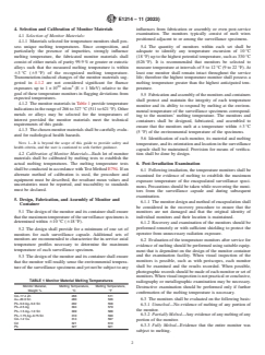 SIGNIFICANCE AND USE 3.1 Temperature monitors are used in surveillance capsules in accordance with Practice E2215 to estimate the maximum value of the surveillance specimen irradiation temperature. Temperature monitors are needed to give evidence of overheating of surveillance specimens beyond the expected temperature. Because overheating causes a reduction in the amount of neutron radiation damage to the surveillance specimens, this overheating could result in a change in the measured properties of the surveillance specimens that would lead to an unconservative prediction of damage to the reactor vessel material. 3.2 The magnitude of the reduction of radiation damage with overheating depends on the composition of the material and time at temperature. Guide E900 provides an accepted method for quantifying the temperature effect. Because the evidence from melt wire monitors gives no indication of the duration of overheating above the expected temperature as indicated by melting of the monitor, the significance of overheating events cannot be quantified on the basis of temperature monitors alone. Indication of overheating does serve to alert the user of the data to further evaluate the irradiation temperature exposure history of the surveillance capsule. 3.3 This guide is included in Master Matrix E706 that relates several standards used for irradiation surveillance of light-water reactor vessel materials. It is intended primarily to amplify the requirements of Practice E185 in the design of temperature monitors for the surveillance program. It may also be used in conjunction with Practice E2215 to evaluate the post-irradiation test measurements. SCOPE 1.1 This guide describes the application of melt wire temperature monitors and their use for reactor vessel surveillance of light-water power reactors as called for in Practices E185 and E2215. 1.2 The purpose of this guide is to recommend the selection and use of the common melt wire technique where the correspondence between melting temperature and composition of different alloys is used as a passive temperature monitor. Guidelines are provided for the selection and calibration of monitor materials; design, fabrication, and assembly of monitor and container; post-irradiation examinations; interpretation of the results; and estimation of uncertainties. 1.3 The values stated in SI units are to be regarded as standard. The values given in parentheses are mathematical conversions to inch-pound units that are provided for information only and are not considered standard. 1.4 This standard does not purport to address all of the safety concerns, if any, associated with its use. It is the responsibility of the user of this standard to establish appropriate safety, health, and environmental practices and determine the applicability of regulatory limitations prior to use. (See Note 1.) 1.5 This international standard was developed in accordance with internationally recognized principles on standardization established in the Decision on Principles for the Development of International Standards, Guides and Recommendations issued by the World Trade Organization Technical Barriers to Trade (TBT) Committee.