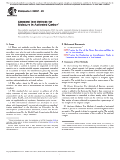 ASTM D2867-23 is a standard published by ASTM International. Its full title is "Standard Test Methods for Moisture in Activated Carbon". This standard covers: SIGNIFICANCE AND USE 4.1 The moisture content of activated carbon is often required to define and express its properties in relation to the net weight of the carbon. 4.2 The moisture content of activated carbon packed in typical shipping containers will usually increase during transportation and storage. Users of activated carbon in applications where low moisture content is important should be aware of this effect. SCOPE 1.1 These test methods provide three procedures for the determination of the moisture content of activated carbon. The procedures may also be used to dry samples required for other tests. The oven drying and moisture balance methods are used when water is the only volatile material present and is in significant quantities, and the activated carbon is not heat sensitive (some activated carbons can ignite spontaneously at temperatures as low as 150 °C). The xylene extraction method is used when a carbon is known or suspected to be heat sensitive or to contain miscible organic compounds instead of or in addition to water. The interferences posed by miscible inorganic compounds has not been determined. The oven drying method described in these test methods may be used as the reference for development of instrumental techniques for moisture determination in activated carbon. 1.2 The values stated in SI units are to be regarded as standard. No other units of measurement are included in this standard. 1.3 This standard does not purport to address all of the safety concerns, if any, associated with its use. It is the responsibility of the user of this standard to establish appropriate safety, health, and environmental practices and determine the applicability of regulatory limitations prior to use. 1.4 This international standard was developed in accordance with internationally recognized principles on standardization established in the Decision on Principles for the Development of International Standards, Guides and Recommendations issued by the World Trade Organization Technical Barriers to Trade (TBT) Committee.
