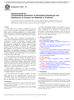ASTM F2577-22 is a guide published by ASTM International. Its full title is "Standard Guide for Compositional Evaluation of Declarable Substances and Substances of Concern for Materials in Products". This standard covers: SIGNIFICANCE AND USE 4.1 Regulations, standards, and market-defined requirements for chemical constituent (“substances of interest”) compliance and conformance have become increasing numerous and complex. Specific laws and standards may pertain to certain product and industry segments, for example, electrical/electronic instruments and components, pharmaceuticals, medical devices, consumer products, agrichemicals, and so forth. Others may be broader and relate specifically to assessment and management of specific chemical compounds or classes across multiple product sectors and sources, for example Ref (2). In addition, such requirements may be issued by national authorities, international standards setting groups, or, in the case of market-defined requirements, even by customer advocacy organizations or customers through supply contracts. The resulting global landscape of requirements and market access expectations is complex, and compliance/conformance presents numerous challenges for manufacturers. Note 1: For example, IEC 62474:2012 provides some standardized definitions for reporting thresholds and declaration statements for electrotechnical industry. In another example, ISO 14021:2016 addresses self-declared environmental claims. 4.2 Declarable substances may be found on various lists and forms, including those listed in Refs (2-10) and on supply agreements and questionnaires. This guide is not intended to be exhaustive nor cover all declarable substances. Nor does this guide address specific declaration and labeling requirements within these regulation and standards nor address product safety and compliance requirements as dictated by law for specific products, industries, or market regions. 4.3 In addition to new laws and standards, more chemical substances are continually added to a variety of screening lists for review of potential hazards, identification and quantification of possible health or environmental hazards, or both, and consideration of control measures. To ... SCOPE 1.1 This guide uses case studies to illustrate the decision process to assess materials and products for declarable substances when evaluating conformance to relevant requirements. This may be accomplished by applying existing knowledge to determine the need for further action (for example, testing). 1.2 This guide assists in utilization and interpretation of various forms of information gathered to enable compliance or conformance or both to regulations, standards, supply agreements, or customer enquiries related to identified declarable substances, including the evidence required to issue declarations for the absence or presence of a declarable substance. Several examples are referenced. The target declarable substances will be specific to the product and product classification, the regulatory jurisdiction, customer/supplier requirements, and other relevant considerations. Consideration of which regulations and standards apply to a given product is beyond the scope of this guide. 1.3 The framework covered in this guide attempts to harmonize language used in the absence of objective data or specific regulatory requirements or both. This guide draws on a variety of existing documentation, which will be cited and referenced, as well as basic scientific principles for communication of chemical hazard and risk, and may be used as an approach for assessing composition of products and their components as part of product risk assessment. 1.4 This guide is applicable to a variety of materials, including polymeric and elastomeric materials, which are used in regulated industries and products. 1.5 This standard does not purport to address all of the safety concerns, if any, associated with its use. It is the responsibility of the user of this standard to establish appropriate safety, health, and environmental practices and determine the applicability of regulatory limitations prior to use. 1.6 This international st...