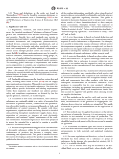 SIGNIFICANCE AND USE 4.1 Regulations, standards, and market-defined requirements for chemical constituent (“substances of interest”) compliance and conformance have become increasing numerous and complex. Specific laws and standards may pertain to certain product and industry segments, for example, electrical/electronic instruments and components, pharmaceuticals, medical devices, consumer products, agrichemicals, and so forth. Others may be broader and relate specifically to assessment and management of specific chemical compounds or classes across multiple product sectors and sources, for example Ref (2). In addition, such requirements may be issued by national authorities, international standards setting groups, or, in the case of market-defined requirements, even by customer advocacy organizations or customers through supply contracts. The resulting global landscape of requirements and market access expectations is complex, and compliance/conformance presents numerous challenges for manufacturers. Note 1: For example, IEC 62474:2012 provides some standardized definitions for reporting thresholds and declaration statements for electrotechnical industry. In another example, ISO 14021:2016 addresses self-declared environmental claims. 4.2 Declarable substances may be found on various lists and forms, including those listed in Refs (2-10) and on supply agreements and questionnaires. This guide is not intended to be exhaustive nor cover all declarable substances. Nor does this guide address specific declaration and labeling requirements within these regulation and standards nor address product safety and compliance requirements as dictated by law for specific products, industries, or market regions. 4.3 In addition to new laws and standards, more chemical substances are continually added to a variety of screening lists for review of potential hazards, identification and quantification of possible health or environmental hazards, or both, and consideration of control measures. To ... SCOPE 1.1 This guide uses case studies to illustrate the decision process to assess materials and products for declarable substances when evaluating conformance to relevant requirements. This may be accomplished by applying existing knowledge to determine the need for further action (for example, testing). 1.2 This guide assists in utilization and interpretation of various forms of information gathered to enable compliance or conformance or both to regulations, standards, supply agreements, or customer enquiries related to identified declarable substances, including the evidence required to issue declarations for the absence or presence of a declarable substance. Several examples are referenced. The target declarable substances will be specific to the product and product classification, the regulatory jurisdiction, customer/supplier requirements, and other relevant considerations. Consideration of which regulations and standards apply to a given product is beyond the scope of this guide. 1.3 The framework covered in this guide attempts to harmonize language used in the absence of objective data or specific regulatory requirements or both. This guide draws on a variety of existing documentation, which will be cited and referenced, as well as basic scientific principles for communication of chemical hazard and risk, and may be used as an approach for assessing composition of products and their components as part of product risk assessment. 1.4 This guide is applicable to a variety of materials, including polymeric and elastomeric materials, which are used in regulated industries and products. 1.5 This standard does not purport to address all of the safety concerns, if any, associated with its use. It is the responsibility of the user of this standard to establish appropriate safety, health, and environmental practices and determine the applicability of regulatory limitations prior to use. 1.6 This international st...