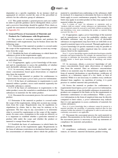 1.2 This guide assists in utilization and interpretation of various forms of information gathered to enable compliance or conformance or both to regulations, standards, supply agreements, or customer enquiries related to identified declarable substances, including the evidence required to issue declarations for the absence or presence of a declarable substance. Several examples are referenced. The target declarable substances will be specific to the product and product classification, the regulatory jurisdiction, customer/supplier requirements, and other relevant considerations. Consideration of which regulations and standards apply to a given product is beyond the scope of this guide.