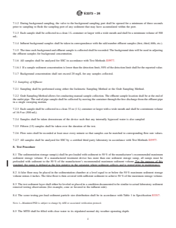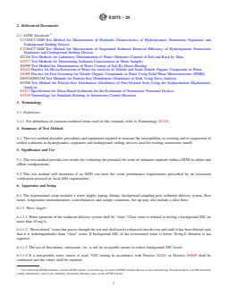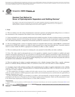 SIGNIFICANCE AND USE 5.1 This test method provides test results for evaluating the potential for scour of sediment captured within a MTD in online and offline configurations. 5.2 This test method will determine if an MTD can meet the scour performance requirements prescribed by an associated verification protocol or local AHJ requirements. SCOPE 1.1 This test method covers the testing of hydrodynamic stormwater separators and underground settling devices as it relates to the measurement of the resuspension and washout (scour) of previously captured sediment. 1.2 Units tested shall be of a size commonly manufactured and available for purchase. In order to facilitate testing it is permissible to substitute alternate materials for the housing and structural components of the test units if operational components are at full size, with identical dimensions, configurations and materials specified for commercial use. Scale models are not permissible. 1.3 The test method provides a means of evaluating retention of suspended solids previously captured with a manufactured treatment device (MTD) that is placed as an offline or online treatment device along storm drain pipe lines. It provides criteria in which to evaluate whether the MTD is appropriate for installation in offline or online conditions. 1.4 This test method provides the means for evaluating the scour potential for both offline and online conditions. 1.5 Units—The values stated in inch-pound units are to be regarded as standard, except for methods to establish and report sediment concentration and particle size. It is convention to exclusively describe sediment concentration in mg/L and particle size in mm or μm, both of which are SI units. The SI units given in parentheses are mathematical conversions, which are provided for information purposes only and are not considered standard. Reporting of test results in units other than inch-pound units shall not be regarded as non-conformance with this test method. 1.6 This test method may be subject to specific requirements set by a Quality Assurance Project Plan, a specific verification protocol, or Authority Having Jurisdiction (AHJ). It is advised to review one or all of the above to ensure compliance 1.7 Acceptance of test results attained according to this specification may be subject to specific requirements set by a Quality Assurance Project Plan, a specific verification protocol, or Authority Having Jurisdiction (AHJ). It is advised to review one or all of the above to ensure compliance. 1.8 This standard does not purport to address all of the safety concerns, if any, associated with its use. It is the responsibility of the user of this standard to establish appropriate safety, health, and environmental practices and determine the applicability of regulatory limitations prior to use. 1.9 This international standard was developed in accordance with internationally recognized principles on standardization established in the Decision on Principles for the Development of International Standards, Guides and Recommendations issued by the World Trade Organization Technical Barriers to Trade (TBT) Committee.