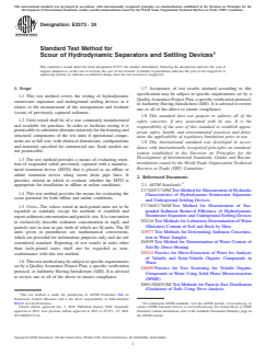 ASTM E3373-24 is a standard published by ASTM International. Its full title is "Standard Test Method for Scour of Hydrodynamic Separators and Settling Devices". This standard covers: SIGNIFICANCE AND USE 5.1 This test method provides test results for evaluating the potential for scour of sediment captured within a MTD in online and offline configurations. 5.2 This test method will determine if an MTD can meet the scour performance requirements prescribed by an associated verification protocol or local AHJ requirements. SCOPE 1.1 This test method covers the testing of hydrodynamic stormwater separators and underground settling devices as it relates to the measurement of the resuspension and washout (scour) of previously captured sediment. 1.2 Units tested shall be of a size commonly manufactured and available for purchase. In order to facilitate testing it is permissible to substitute alternate materials for the housing and structural components of the test units if operational components are at full size, with identical dimensions, configurations and materials specified for commercial use. Scale models are not permissible. 1.3 The test method provides a means of evaluating retention of suspended solids previously captured with a manufactured treatment device (MTD) that is placed as an offline or online treatment device along storm drain pipe lines. It provides criteria in which to evaluate whether the MTD is appropriate for installation in offline or online conditions. 1.4 This test method provides the means for evaluating the scour potential for both offline and online conditions. 1.5 Units—The values stated in inch-pound units are to be regarded as standard, except for methods to establish and report sediment concentration and particle size. It is convention to exclusively describe sediment concentration in mg/L and particle size in mm or μm, both of which are SI units. The SI units given in parentheses are mathematical conversions, which are provided for information purposes only and are not considered standard. Reporting of test results in units other than inch-pound units shall not be regarded as non-conformance with this test method. 1.6 This test method may be subject to specific requirements set by a Quality Assurance Project Plan, a specific verification protocol, or Authority Having Jurisdiction (AHJ). It is advised to review one or all of the above to ensure compliance 1.7 Acceptance of test results attained according to this specification may be subject to specific requirements set by a Quality Assurance Project Plan, a specific verification protocol, or Authority Having Jurisdiction (AHJ). It is advised to review one or all of the above to ensure compliance. 1.8 This standard does not purport to address all of the safety concerns, if any, associated with its use. It is the responsibility of the user of this standard to establish appropriate safety, health, and environmental practices and determine the applicability of regulatory limitations prior to use. 1.9 This international standard was developed in accordance with internationally recognized principles on standardization established in the Decision on Principles for the Development of International Standards, Guides and Recommendations issued by the World Trade Organization Technical Barriers to Trade (TBT) Committee.