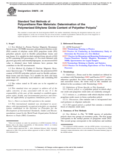 ASTM D4875-24 is a standard published by ASTM International. Its full title is "Standard Test Methods of Polyurethane Raw Materials: Determination of the Polymerized Ethylene Oxide Content of Polyether Polyols". This standard covers: SIGNIFICANCE AND USE 5.1 Measurements of EO content correlate to polyol reactivity (as related to primary hydroxyl content), linearity of foam rise, and hydrophilicity of the polyol and final product. SCOPE 1.1 Test Method A—Proton Nuclear Magnetic Resonance Spectroscopy (1H NMR) measures polymerized ethylene oxide (EO) content of ethylene oxide (EO) propylene oxide (PO) polyether polyols used in flexible polyurethane foams and non-foams. It is suitable for diols initiated from glycols of EO or PO containing EO percentages >5. For triols initiated with glycerol (glycerin) and trimethylolpropane, an uncorrected EO value is obtained since both initiators have protons that contribute to the EO measurement. 1.2 Test Method B—Carbon-13 Nuclear Magnetic Resonance Spectroscopy (13C NMR) measures the polymerized EO content of EO-PO polyether polyols used in flexible polyurethane foams and non-foams. It is suitable for diols and triols made from the commonly used initiators and containing EO percentages >5. 1.3 The values stated in SI units are to be regarded as standard. 1.4 This standard does not purport to address all of the safety concerns, if any, associated with its use. It is the responsibility of the user of this standard to establish appropriate safety, health, and environmental practices and determine the applicability of regulatory limitations prior to use. Note 1: There is no known ISO equivalent to this standard. 1.5 This international standard was developed in accordance with internationally recognized principles on standardization established in the Decision on Principles for the Development of International Standards, Guides and Recommendations issued by the World Trade Organization Technical Barriers to Trade (TBT) Committee.