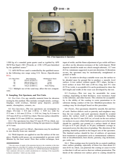 ASTM G105-20 is a standard published by ASTM International. Its full title is "Standard Test Method for Conducting Wet Sand/Rubber Wheel Abrasion Tests". This standard covers: SIGNIFICANCE AND USE 5.1 The severity of abrasive wear in any system will depend upon the abrasive particle size, shape and hardness, the magnitude of the stress imposed by the particle, and the frequency of contact of the abrasive particle. In this test method these conditions are standardized to develop a uniform condition of wear which has been referred to as scratching abrasion (1 and 2). Since the test method does not attempt to duplicate all of the process conditions (abrasive size, shape, pressure, impact or corrosive elements), it should not be used to predict the exact resistance of a given material in a specific environment. The value of the test method lies in predicting the ranking of materials in a similar relative order of merit as would occur in an abrasive environment. Volume loss data obtained from test materials whose lives are unknown in a specific abrasive environment may, however, be compared with test data obtained from a material whose life is known in the same environment. The comparison will provide a general indication of the worth of the unknown materials if abrasion is the predominant factor causing deterioration of the materials. SCOPE 1.1 This test method covers laboratory procedures for determining the resistance of metallic materials to scratching abrasion by means of the wet sand/rubber wheel test. It is the intent of this procedure to provide data that will reproducibly rank materials in their resistance to scratching abrasion under a specified set of conditions. 1.2 Abrasion test results are reported as volume loss in cubic millimetres. Materials of higher abrasion resistance will have a lower volume loss. 1.3 The values stated in SI units are to be regarded as standard. The values given in parentheses after SI units are provided for information only and are not considered standard. 1.4 This standard does not purport to address all of the safety concerns, if any, associated with its use. It is the responsibility of the user of this standard to establish appropriate safety, health, and environmental practices and determine the applicability of regulatory limitations prior to use. 1.5 This international standard was developed in accordance with internationally recognized principles on standardization established in the Decision on Principles for the Development of International Standards, Guides and Recommendations issued by the World Trade Organization Technical Barriers to Trade (TBT) Committee.