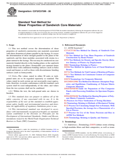 ASTM C273/C273M-20 is a standard published by ASTM International. Its full title is "Standard Test Method for Shear Properties of Sandwich Core Materials". This standard covers: SIGNIFICANCE AND USE 5.1 The core shear properties are fundamental properties that are used in the design of sandwich panels. This test method provides information on the force-deflection behavior of sandwich constructions or cores when loaded in shear parallel to the plane of the facings. From a complete force-deflection curve, it is possible to compute core shear stress at any force (such as the shear stress at proportional limit, at yield, or at maximum force) and to compute an effective core shear modulus. 5.2 The test does not produce pure shear, but the specimen length is prescribed so that secondary stresses have a minimum effect. Approximate shear properties can also be obtained from a sandwich flexure test (see Test Method C393). 5.3 This test method provides a standard method of obtaining sandwich core shear data for material specifications, sandwich panel design, research and development applications, and quality assurance. 5.4 Factors that influence core shear strength and shall therefore be reported include the following: facing material, core material, adhesive material, methods of material fabrication, core geometry (density, cell size, orientation, and so forth), adhesive thickness, specimen geometry and associated measurement accuracy, specimen preparation, specimen conditioning, environment of testing, specimen alignment, loading procedure, speed of testing, and adhesive void content. Further, core-to-facing strength may be different between precured/bonded and co-cured facings in sandwich panels with the same core and facing material. SCOPE 1.1 This test method covers the determination of shear properties of sandwich construction core materials associated with shear distortion of planes parallel to the facings. It covers the determination of shear strength parallel to the plane of the sandwich, and the shear modulus associated with strains in a plane normal to the facings. The test may be conducted on core materials bonded directly to the loading plates or the sandwich facings bonded to the plates. Permissible core material forms include those with continuous bonding surfaces (such as balsa wood and foams) as well as those with discontinuous bonding surfaces (such as honeycomb). 1.2 Units—The values stated in either SI units or inch-pound units are to be regarded separately as standard. The values stated in each system are not necessarily exact equivalents; therefore, to ensure conformance with the standard, each system shall be used independently of the other, and values from the two systems shall not be combined. 1.2.1 Within the text, the inch-pound units are shown in brackets. 1.3 This standard does not purport to address all of the safety concerns, if any, associated with its use. It is the responsibility of the user of this standard to establish appropriate safety, health, and environmental practices and determine the applicability of regulatory limitations prior to use. 1.4 This international standard was developed in accordance with internationally recognized principles on standardization established in the Decision on Principles for the Development of International Standards, Guides and Recommendations issued by the World Trade Organization Technical Barriers to Trade (TBT) Committee.