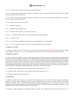 SIGNIFICANCE AND USE 5.1 This test practice is designed to produce tensile property data for material specifications, research and development, quality assurance, and structural design and analysis. Factors that influence the tensile response and should therefore be reported include the following: materials (laminates and adhesive), methods of material preparation including surface preparation prior to bonding, lay-ups, specimen stacking sequence, joint taper ratio or step length, ply overlap length, material relative thicknesses and stiffness of the parent and repair laminates, adhesive bond stiffness, specimen preparation, specimen conditioning, environment of testing, specimen alignment and gripping, speed of testing, time at temperature, void content, and volume percent reinforcement. Properties in the test direction, which may be obtained from this test practice, include the following: 5.1.1 Ultimate tensile strength (based on the nominal parent material thickness), (Fptu). 5.1.2 Ultimate tensile strength (based on the nominal repair material thickness), (Frtu). 5.1.3 Ultimate running force per repair ply, (Nj). SCOPE 1.1 This test practice defines the procedure for determination of the tensile strength of a tapered or stepped joint of polymer matrix composite materials. It is applicable to secondary bonded or co-bonded laminates with either unidirectional plies or woven fabric reinforcements. The materials to be bonded may be different material systems. In the bondline, a separate adhesive material may or may not be used (example: adhesives may be used with a prepreg system or may not be used with a wet lay-up repair system). The range of acceptable test laminates and thicknesses is described in 8.2.1. 1.2 This practice supplements Test Method D3039/D3039M for tensile loading. Several important test specimen parameters (for example, joint length, ply overlaps, step depth, and taper ratio) are not mandated by this practice, however, these parameters are required to be specified and reported to support repeatable results. 1.3 Unidirectional (0° ply orientation) tape composites, textile composites, as well as multidirectional composite laminates, can be tested. 1.4 Units—The values stated in either SI units or inch-pound units are to be regarded separately as standard. The values stated in each system are not necessarily exact equivalents; therefore, to ensure conformance with the standard, each system shall be used independently of the other, and values from the two systems shall not be combined. 1.4.1 Within the text the inch-pound units are shown in brackets. 1.5 This standard does not purport to address all of the safety concerns, if any, associated with its use. It is the responsibility of the user of this standard to establish appropriate safety, health, and environmental practices and determine the applicability of regulatory limitations prior to use. 1.6 This international standard was developed in accordance with internationally recognized principles on standardization established in the Decision on Principles for the Development of International Standards, Guides and Recommendations issued by the World Trade Organization Technical Barriers to Trade (TBT) Committee.