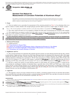 SIGNIFICANCE AND USE 3.1 The corrosion potential of an aluminum alloy depends upon the amounts of certain alloying elements that the alloy contains in solid solution. Copper and zinc, which are two of the major alloying elements for aluminum, have the greatest effect with copper shifting the potential in the noble or positive direction, and zinc in the active or negative direction. For example, commercially unalloyed aluminum (1100 alloy) has a potential of –750 mV when measured in accordance with this method, 2024–T3 alloy with nearly all of its nominal 4.3 % copper in solid solution, a potential of –600 mV to –620 mV, depending upon the rate of quenching and 7072 alloy with nearly all of its nominal 1.0 % zinc in solid solution, a potential of –885 mV (SCE) (1-3).3 3.2 Because it reflects the amount of certain alloying elements in solid solution, the corrosion potential is a useful tool for characterizing the metallurgical condition of aluminum alloys, especially those of the 2XXX and 7XXX types, which contain copper and zinc as major alloying elements. Its uses include the determination of the effectiveness of solution heat treatment and annealing (1), of the extent of precipitation during artificial aging (4) and welding (5), and of the extent of diffusion of alloying elements from the core into the cladding of Alclad products (2). SCOPE 1.1 This test method covers a procedure for measurement of the corrosion potential (see Note 1) of an aluminum alloy in an aqueous solution of sodium chloride with enough hydrogen peroxide added to provide an ample supply of cathodic reactant. Note 1: The corrosion potential is sometimes referred to as the open-circuit solution or rest potential. See Terminology G193. 1.2 The values stated in SI units are to be regarded as standard. No other units of measurement are included in this standard. 1.3 This standard does not purport to address all of the safety concerns, if any, associated with its use. It is the responsibility of the user of this standard to establish appropriate safety, health, and environmental practices and determine the applicability of regulatory limitations prior to use. 1.4 This international standard was developed in accordance with internationally recognized principles on standardization established in the Decision on Principles for the Development of International Standards, Guides and Recommendations issued by the World Trade Organization Technical Barriers to Trade (TBT) Committee.