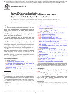 SIGNIFICANCE AND USE 5.1 Knitted fabrics should meet all of the requirements in Table 1 to be suitable for use in the manufacture of dress suits and sportswear jackets, slacks, and trousers for men and boys. 5.2 It is recognized that for purposes of fashion or aesthetics the ultimate consumer of articles made from these fabrics may find acceptable some fabrics that do not conform to all of the requirements in Table 1. For example, the fabric could be dyed in shades that do not meet the requirement in Table 1 for colorfastness to light, yet be acceptable to the ultimate consumer because the shade is fashionable. In such cases, one or more of the requirements may be modified by mutual agreement between the purchaser and the seller. 5.2.1 If any of the requirements in Table 1 are modified by mutual agreement between the purchaser and the seller, any reference to the specification shall specify that “this fabric meets ASTM Specification D3782 except for the following characteristic(s).” 5.3 The uses and significance of particular properties are discussed in the appropriate sections of the specific methods. SCOPE 1.1 This performance specification covers men's and boys' knitted dress suit and knitted sportswear jacket, slack, and trouser fabrics composed of any textile fiber or mixture of textile fibers. 1.2 This performance specification is not applicable to knitted fabrics used for interlinings. 1.3 These requirements apply to the length and width directions for those properties where fabric direction is pertinent. 1.4 This standard does not purport to address all of the safety concerns, if any, associated with its use. It is the responsibility of the user of this standard to establish appropriate safety, health, and environmental practices and determine the applicability of regulatory limitations prior to use. 1.5 This international standard was developed in accordance with internationally recognized principles on standardization established in the Decision on Principles for the Development of International Standards, Guides and Recommendations issued by the World Trade Organization Technical Barriers to Trade (TBT) Committee.