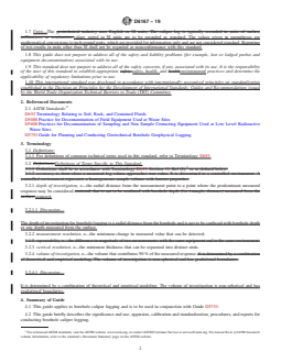 SIGNIFICANCE AND USE 5.1 An appropriately developed, documented, and executed guide is essential for the proper collection and application of caliper logs. This guide is to be used in conjunction with Guide D5753. 5.2 The benefits of its use include the following: improving selection of caliper logging methods and equipment, caliper log quality and reliability, and usefulness of the caliper log data for subsequent display and interpretation. 5.3 This guide applies to commonly used caliper logging methods for geotechnical applications. 5.4 It is essential that personnel (see the Personnel section of Guide D5753) consult up-to-date textbooks and reports on the caliper technique, application, and interpretation methods. SCOPE 1.1 This guide covers the general procedures necessary to conduct caliper logging of boreholes, wells, access tubes, caissons, or shafts (hereafter referred to as boreholes) as commonly applied to geologic, engineering, groundwater, and environmental (hereafter referred to as geotechnical) investigations. Caliper logging for mineral or petroleum exploration and development are excluded. 1.1.1 This guide offers an organized collection of information or a series of options and does not recommend a specific course of action. This document cannot replace education or experience and should be used in conjunction with professional judgment. Not all aspects of this guide may be applicable in all circumstances. This ASTM standard is not intended to represent or replace the standard of care by which the adequacy of a given professional service must be judged, nor should this document be applied without consideration of a project’s many unique aspects. The word “Standard” in the title of this document means only that the document has been approved through the ASTM consensus process. 1.2 This guide defines a caliper log as a record of borehole diameter with depth. 1.2.1 Caliper logs are essential in the interpretation of geophysical logs since geophysical results can be significantly affected by borehole diameter. 1.2.2 Caliper logs provide useful information for borehole completion and testing and are commonly used to assess borehole diameter, shape, roughness, and stability; calculate borehole volume; provide information on borehole construction; and delineate lithologic contacts, fractures, and solution cavities and other openings. 1.2.2.1 Borehole-diameter information is essential for calculation of volumetric rate from flowmeter logs. 1.2.2.2 Caliper logs are used to locate the optimum placement of inflatable packers for borehole testing. Inflatable packers can only form an effective seal within a specified range of borehole diameters, and can be damaged if they are set in rough or irregular parts of the borehole. 1.2.2.3 Caliper logs are used to estimate the volume of borehole completion material (cement, gravel, etc.) needed to fill the annular space between borehole and casing(s) or well screen. 1.2.2.4 Caliper logs may be applied to correlate lithology between boreholes based upon enlargements related to lithology. The measured borehole diameter may be significantly different than the drilled diameter because of plastic formations expanded into the borehole and friable formations enlarging the borehole. A series of caliper logs may also show increases or decreases in borehole diameter with time. 1.3 This guide is restricted to mechanically based devices with spring-loaded arms, which are the most common calipers used in caliper logging with geotechnical applications. 1.4 This guide provides an overview of caliper logging, including general procedures, specific documentation, calibration and standardization, and log quality and interpretation. 1.5 This guide is to be used in conjunction with Guide D5753. 1.6 This guide should not be used as a sole criterion for caliper logging and does not replace professional judgment. Caliper logging procedures should b...