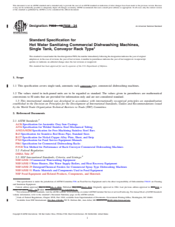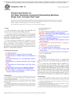 ASTM F858-24 is a technical specification published by ASTM International. Its full title is "Standard Specification for Hot Water Sanitizing Commercial Dishwashing Machines, Single Tank, Conveyor Rack Type". This standard covers: ABSTRACT This specification covers single tank, automatic rack type, hot water sanitizing commercial dishwashing machines. Covered by this specification are dishwashing machines of various types (Types I and II based on feed direction, from right or left, respectively), styles (Styles 1-3 based on method of heating: steam, electric, or gas), classes (Classes A-D based on heat source: injector, heat exchange coil, natural gas, or LP gas), sizes, and capacities. Components comprising the dishwashing machine shall be manufactured from corrosion-resistant steel (tank, scrap trays or strainers, overflow drain, access door/s, and legs), corrosion-resisting materials (conveyor, piping and fittings, valves, and spray assemblies), nickel-copper alloys, and plastics. Pump casings shall be of cast iron or corrosion-resisting material. When specified, the dishwashing machine assembly may include a final rinse booster, detergent feeder, and rinse agent feeder. The dishwashing machine shall be tested for performance standards compliance and noise level as well as for operational, leakage, and performance profile requirements. All tests shall comply with the requirements specified. SCOPE 1.1 This specification covers single tank, automatic rack conveyor type, commercial dishwashing machines. 1.2 The values stated in inch-pound units are to be regarded as standard. The values given in parentheses are mathematical conversions to SI units that are provided for information only and are not considered standard. 1.3 This international standard was developed in accordance with internationally recognized principles on standardization established in the Decision on Principles for the Development of International Standards, Guides and Recommendations issued by the World Trade Organization Technical Barriers to Trade (TBT) Committee.