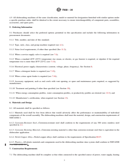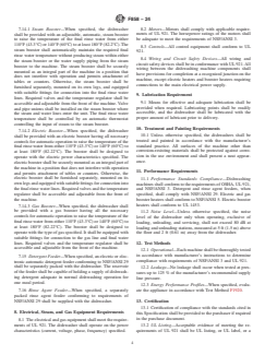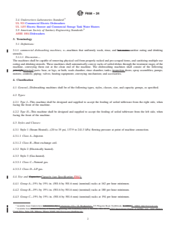 ABSTRACT This specification covers single tank, automatic rack type, hot water sanitizing commercial dishwashing machines. Covered by this specification are dishwashing machines of various types (Types I and II based on feed direction, from right or left, respectively), styles (Styles 1-3 based on method of heating: steam, electric, or gas), classes (Classes A-D based on heat source: injector, heat exchange coil, natural gas, or LP gas), sizes, and capacities. Components comprising the dishwashing machine shall be manufactured from corrosion-resistant steel (tank, scrap trays or strainers, overflow drain, access door/s, and legs), corrosion-resisting materials (conveyor, piping and fittings, valves, and spray assemblies), nickel-copper alloys, and plastics. Pump casings shall be of cast iron or corrosion-resisting material. When specified, the dishwashing machine assembly may include a final rinse booster, detergent feeder, and rinse agent feeder. The dishwashing machine shall be tested for performance standards compliance and noise level as well as for operational, leakage, and performance profile requirements. All tests shall comply with the requirements specified. SCOPE 1.1 This specification covers single tank, automatic rack conveyor type, commercial dishwashing machines. 1.2 The values stated in inch-pound units are to be regarded as standard. The values given in parentheses are mathematical conversions to SI units that are provided for information only and are not considered standard. 1.3 This international standard was developed in accordance with internationally recognized principles on standardization established in the Decision on Principles for the Development of International Standards, Guides and Recommendations issued by the World Trade Organization Technical Barriers to Trade (TBT) Committee.