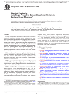ASTM F2551-09(2023) is a standard published by ASTM International. Its full title is "Standard Practice for Installing a Protective Cementitious Liner System in Sanitary Sewer Manholes". This standard covers: ABSTRACT This practice describes the procedures involved in the structural reinforcement, sealing, protection, and rehabilitation of sanitary sewer manholes by the application of a prepackaged protective cementitious liner system to all cleaned interior surface from the bottom of the frame to the bench. The manholes to which the cementitious liner shall be applied may be made of brick, concrete, block, and various other materials. Detailed descriptions are given for all prepackaged materials necessary for this practice that include materials for substrate repairs, cementitious repair materials, infiltration water control materials, cementitious water control materials, chemical grout materials, and lining materials. Detailed descriptions are also provided for each procedure involved here which includes surface preparation, high pressure cleaning, surface repair, mixing of prepackaged cementitious repair materials, spray application of the cement liner by manual surface sealing or centrifugal cast process, and curing of the freshly applied cementitious mortar. SCOPE 1.1 This specification describes all the work required to structurally reinforce, seal, and protect sanitary sewer manholes. Applications include applying a prepackaged cementitious liner that can function as a full depth restoration or a partial depth repair. A uniform high-strength, fiber-reinforced cementitious mortar should be manually sprayed and hand troweled or centrifugally cast in a uniform, prescribed thickness to all cleaned, interior surfaces from the bottom of the frame to the bench. The cementitious liner may be applied to manholes constructed of brick, concrete, block, and various other materials. 1.2 A manufacturer’s approved applicator shall furnish the complete application of the protective, prepackaged cementitious liner material. All of the cleaning, preparation, and application procedures shall be in accordance with the manufacturer’s recommendations. 1.3 The values stated in inch-pound units are to be regarded as standard. The values given in parentheses are mathematical conversions to SI units that are provided for information only and are not considered standard. 1.4 This standard does not purport to address all of the safety concerns, if any, associated with its use. It is the responsibility of the user of this standard to establish appropriate safety, health, and environmental practices and determine the applicability of regulatory limitations prior to use. Manholes are permit required confined spaces in accordance with OSHA definition and should be treated as such, requiring confined space entry permits, appropriate monitoring equipment, and the associated personal protective equipment. 1.5 This international standard was developed in accordance with internationally recognized principles on standardization established in the Decision on Principles for the Development of International Standards, Guides and Recommendations issued by the World Trade Organization Technical Barriers to Trade (TBT) Committee.