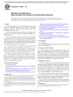 ASTM D4381/D4381M-22 is a standard published by ASTM International. Its full title is "Standard Test Method for Sand Content by Volume of Construction Slurries". This standard covers: SIGNIFICANCE AND USE 5.1 This test method is used to determine the percentage of sand by volume in construction slurry. The significance of this test method mainly relates to construction slurries used for concrete wall and drilled piers construction. The range of measurement is too limited for use in applications where the sand content is intended to be greater than 20 %, such as in the cases of cement bentonite or soil bentonite walls. 5.2 A high sand content in the construction slurry is abrasive for construction plant such as pumps, and is furthermore adverse to the formation of a filter cake in applications where bentonite fluid is used to stabilize an excavation. Note 1: The quality of the result produced by this standard depends on the competence of the personnel performing it and the suitability of the equipment and facilities being used. Agencies that meet the criteria of Practice D3740 are generally considered capable of competent and objective testing, sampling, inspection, etc. Users of this standard are cautioned that compliance with Practice D3740 does not in itself ensure reliable results. Reliable results depend on many factors; Practice D3740 provides a means of evaluating some of those factors. SCOPE 1.1 This test method covers the determination of the sand content of bentonitic slurries used in slurry construction techniques. This test method has been modified from API Recommended Practice 13B. 1.2 All observed and calculated values shall conform to the guidelines for significant digits and rounding established in Practice D6026. 1.3 Units—The values stated in SI units are to be regarded as standard. No other units of measurement are included in this standard. Except, the sieve designation is identified using the “alternative” system in accordance with Practice E11 instead of the “standard system,” such that the sieve used is referred to as a No. 200 sieve, instead of a 75 µm sieve. 1.4 This standard does not purport to address all of the safety concerns, if any, associated with its use. It is the responsibility of the user of this standard to establish appropriate safety, health, and environmental practices and determine the applicability of regulatory limitations prior to use. 1.5 This international standard was developed in accordance with internationally recognized principles on standardization established in the Decision on Principles for the Development of International Standards, Guides and Recommendations issued by the World Trade Organization Technical Barriers to Trade (TBT) Committee.