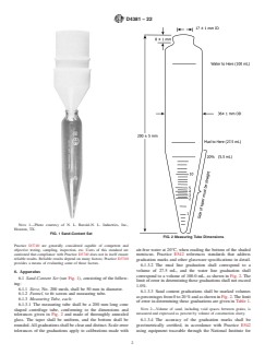 SIGNIFICANCE AND USE 5.1 This test method is used to determine the percentage of sand by volume in construction slurry. The significance of this test method mainly relates to construction slurries used for concrete wall and drilled piers construction. The range of measurement is too limited for use in applications where the sand content is intended to be greater than 20 %, such as in the cases of cement bentonite or soil bentonite walls. 5.2 A high sand content in the construction slurry is abrasive for construction plant such as pumps, and is furthermore adverse to the formation of a filter cake in applications where bentonite fluid is used to stabilize an excavation. Note 1: The quality of the result produced by this standard depends on the competence of the personnel performing it and the suitability of the equipment and facilities being used. Agencies that meet the criteria of Practice D3740 are generally considered capable of competent and objective testing, sampling, inspection, etc. Users of this standard are cautioned that compliance with Practice D3740 does not in itself ensure reliable results. Reliable results depend on many factors; Practice D3740 provides a means of evaluating some of those factors. SCOPE 1.1 This test method covers the determination of the sand content of bentonitic slurries used in slurry construction techniques. This test method has been modified from API Recommended Practice 13B. 1.2 All observed and calculated values shall conform to the guidelines for significant digits and rounding established in Practice D6026. 1.3 Units—The values stated in SI units are to be regarded as standard. No other units of measurement are included in this standard. Except, the sieve designation is identified using the “alternative” system in accordance with Practice E11 instead of the “standard system,” such that the sieve used is referred to as a No. 200 sieve, instead of a 75 µm sieve. 1.4 This standard does not purport to address all of the safety concerns, if any, associated with its use. It is the responsibility of the user of this standard to establish appropriate safety, health, and environmental practices and determine the applicability of regulatory limitations prior to use. 1.5 This international standard was developed in accordance with internationally recognized principles on standardization established in the Decision on Principles for the Development of International Standards, Guides and Recommendations issued by the World Trade Organization Technical Barriers to Trade (TBT) Committee.