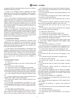 ABSTRACT This guide covers what and how information should be recorded in the field when sampling a ground-water monitoring well. This guide is limited to written documentation of a ground-water sampling event. When sampling ground-water monitoring wells, it is very important to thoroughly document all field activities. It is important to record procedures used and measurements immediately after they have been accomplished and are fresh in the memory. The format of the documentation is discretionary, but should be consistent from well to well and in accordance with regulatory requirements. SIGNIFICANCE AND USE 4.1 When sampling groundwater monitoring wells, it is very important to thoroughly document all field activities. Sufficient field data should be retained to allow one to reconstruct the procedures and conditions that may have affected the integrity of a sample. The field data generated are vital to the interpretation of the chemical data obtained from laboratory analyses of samples. Field data and observations may also be useful to analytical laboratory personnel. 4.2 Due to the changing nature of regulations and other information, users are advised to thoroughly research requirements related to packaging and shipping prior to initiating a sampling event. Note 1: The sampling of an individual groundwater monitoring well should be repeated as closely as possible each time the monitoring well is sampled. This reduces the variability of the chemical parameters due to sampling variability which is the desired result. The intent is to detect the change in chemistry by repeating the sampling protocol at each individual well. This does not mean that all the wells are sampled the same way, nor does it prohibit changes in the sampling protocol, provided they are planned and documented. Note 2: The quality of the results produced by this standard is dependent on the competence of personnel performing it, and the suitability of the equipment and facilities used. Agencies that meet the criteria of Practice D3740 are generally considered capable of competent and objective testing/sampling/inspection/etc. Users of this standard are cautioned that compliance with Practice D3740 does not in itself assure reliable results. Reliable results depend on many factors; Practice D3740 provides a means of evaluating some of those factors. SCOPE 1.1 This guide covers what and how information should be recorded in the field when sampling a groundwater monitoring well. Following these recommendations will provide adequate documentation in most monitoring programs. In some situations, it may be necessary to record additional or different information, or both, to thoroughly document the sampling event. In other cases, it may not be necessary to record all of the information recommended in this guide. The level of documentation will be based on site-specific conditions and regulatory requirements. 1.2 This guide is limited to written documentation of a groundwater sampling event. Other methods of documentation (that is, electronic and audiovisual) can be used but are not addressed in this guide. The specific activities addressed in this guide include documentation of static water level measurement, monitoring well purging, monitoring well sampling, field measurements, groundwater sample preparation, and groundwater sample shipment. 1.3 This standard does not purport to address all of the safety concerns, if any, associated with its use. It is the responsibility of the user of this standard to establish appropriate safety, health, and environmental practices and determine the applicability of regulatory limitations prior to use. 1.4 This guide offers an organized collection of information or a series of options and does not recommend a specific course of action. This document cannot replace education or experience and should be used in conjunction with professional judgment. Not all aspects of this guide may be appli...
