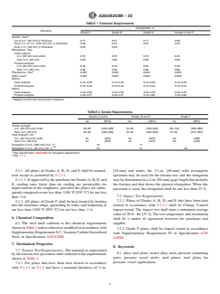 ASTM A203/A203M-23 is a technical specification published by ASTM International. Its full title is "Standard Specification for Pressure Vessel Plates, Alloy Steel, Nickel". This standard covers: ABSTRACT This specification covers nickel-alloy steel plates intended primarily for welded pressure vessels. As a steel making practice, the steel shall be killed and shall conform to fine grain size requirements. The heat treatment requirements for all plates are presented, and all plates under Grades A, B, D, and E shall be normalized as required. The steel shall conform to the required chemical compositions. Two mechanical test requirements are presented that includes, tension test requirements and impact test requirements. SCOPE 1.1 This specification2 covers nickel-alloy steel plates intended primarily for welded pressure vessels. 1.2 Plates under this specification are available with four strength levels and two nickel compositions as follows: Grade Nominal Nickel Content % Yield Strength, min, ksi [MPa] Tensile Strength, min, ksi [MPa] A 2.25 37 [255] 65 [450] B 2.25 40 [275] 70 [485] D 3.50 37 [255] 65 [450] E 3.50 40 [275] 70 [485] F 3.50 2 in. [50 mm] and under 55 [380] 80 [550] Over 2 in. [50 mm] 50 [345] 75 [515] 1.3 The maximum thickness of plates is limited only by the capacity of the composition to meet the specified mechanical property requirements. 1.4 The values stated in either inch-pound units or SI units are to be regarded separately as standard. Within the text, the SI units are shown in brackets. The values stated in each system are not exact equivalents. Therefore, each system must be used independently of the other. Combining values from the two systems may result in nonconformance with this specification. 1.5 This international standard was developed in accordance with internationally recognized principles on standardization established in the Decision on Principles for the Development of International Standards, Guides and Recommendations issued by the World Trade Organization Technical Barriers to Trade (TBT) Committee.