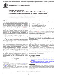 ASTM B761-17(2021), titled "Standard Test Method for Particle Size Distribution of Metal Powders and Related Compounds by X-Ray Monitoring of Gravity Sedimentation," is an internationally recognized standard published by ASTM International. This document specifies a reliable method for determining the particle size distribution of metal powders and related compounds through the use of X-ray monitoring during the sedimentation process under controlled gravity. The standard is a key reference for both producers and purchasers of metal powders, supporting quality control, manufacturing, product specification, and research and development.