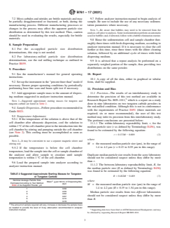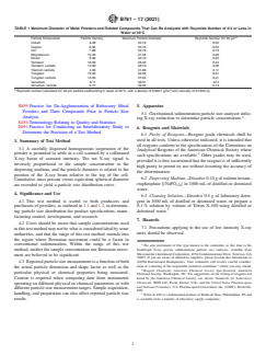 SIGNIFICANCE AND USE 4.1 This test method is useful to both producers and purchasers of powders, as outlined in 1.1 and 1.2, in determining particle size distribution for product specifications, manufacturing control, development, and research. 4.2 Users should be aware that sample concentrations used in this test method may not be what is considered ideal by some authorities, and that the range of this test method extends into the region where Brownian movement could be a factor in conventional sedimentation. Within the range of this test method, neither the sample concentration nor Brownian movement are believed to be significant. 4.3 Reported particle size measurement is a function of both the actual particle dimension and shape factor as well as the particular physical or chemical properties being measured. Caution is required when comparing data from instruments operating on different physical or chemical parameters or with different particle size measurement ranges. Sample acquisition, handling, and preparation can also affect reported particle size results. SCOPE 1.1 This test method covers the determination of particle size distributions of metal powders. Experience has shown that this test method is satisfactory for the analysis of elemental tungsten, tungsten carbide, molybdenum, and tantalum powders, all with an as-supplied estimated average particle size of 6 μm or less, as determined by Test Method B330. Other metal powders (for example, elemental metals, carbides, and nitrides) may be analyzed using this test method with caution as to significance until actual satisfactory experience is developed (see 7.2). The procedure covers the determination of particle size distribution of the powder in the following two conditions: 1.1.1 As the powder is supplied (as-supplied), and 1.1.2 After the powder has been deagglomerated by rod milling as described in Practice B859. 1.2 This test method is applicable to particles of uniform density and composition having a particle size distribution range of 0.1 up to 100 μm. 1.2.1 However, the relationship between size and sedimentation velocity used in this test method assumes that particles sediment within the laminar flow regime. This requires that the particles sediment with a Reynolds number of 0.3 or less. Particle size distribution analysis for particles settling with a larger Reynolds number may be incorrect due to turbulent flow. Some materials covered by this test method may settle with Reynolds number greater than 0.3 if particles greater than 25 μm are present. The user of this test method should calculate the Reynolds number of the largest particle expected to be present in order to judge the quality of obtained results. Reynolds number (Re) can be calculated using the flowing equation where D = the diameter of the largest particle expected to be present, ρ = the particle density, ρ0 = the suspending liquid density, g = the acceleration due to gravity, and η = is the suspending liquid viscosity. A table of the largest particles that can be analyzed with Reynolds number of 0.3 or less in water at 35°C is given for a number of metals in Table 1. A column of the Reynolds number calculated for a 30–μm particle sedimenting in the same liquid system is given for each material also. 1.3 Units—With the exception of the values for density and the mass used to determine density, for which the use of the gram per cubic centimetre (g/cm3) and gram (g) units is the longstanding industry practice, the values in SI units are to be regarded as standard. 1.4 This standard does not purport to address all of the safety concerns, if any, associated with its use. It is the responsibility of the user of this standard to establish appropriate safety, health, and environmental practices and determine the applicability of regulatory limitations prior to use. Specific hazard information is given in Section 7. 1.5 ...