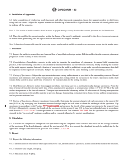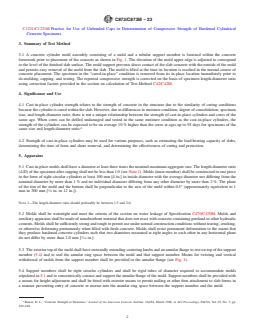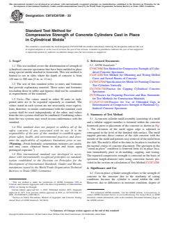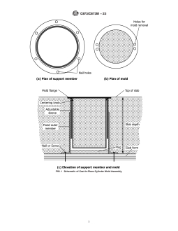 ABSTRACT This test method covers the determination of strength of cylindrical concrete specimens that have been molded in place using special molds attached to formwork. A concrete cylinder mold assembly consisting of a mold and a tubular support member is fastened within the concrete formwork prior to placement of the concrete. The elevation of the mold upper edge is adjusted to correspond to the plane of the finished slab surface. The mold support prevents direct contact of the slab concrete with the outside of the mold and permits its easy removal from the hardened concrete. Strength of cast-in-place cylinders may be used for various purposes, such as estimating the load-bearing capacity of slabs, determining the time of form and shore removal, and determining the effectiveness of curing and protection. Consolidation of concrete in the mold may be varied to simulate the conditions of placement. Internal vibration of concrete in the mold is prohibited except under special circumstances. SIGNIFICANCE AND USE 4.1 Cast-in-place cylinder strength relates to the strength of concrete in the structure due to the similarity of curing conditions because the cylinder is cured within the slab. However, due to differences in moisture condition, degree of consolidation, specimen size, and length-diameter ratio, there is not a unique relationship between the strength of cast-in-place cylinders and cores of the same age. When cores can be drilled undamaged and tested in the same moisture condition as the cast-in-place cylinders, the strength of the cylinders can be expected to be on average 10 % higher than the cores at ages up to 91 days for specimens of the same size and length-diameter ratio.4 4.2 Strength of cast-in-place cylinders may be used for various purposes, such as estimating the load-bearing capacity of slabs, determining the time of form and shore removal, and determining the effectiveness of curing and protection. SCOPE 1.1 This test method covers the determination of strength of cylindrical concrete specimens that have been molded in place using special molds attached to formwork. This test method is limited to use in slabs where the depth of concrete is from 125 mm to 300 mm [5 in. to 12 in.]. 1.2 The text of this standard refers to notes and footnotes that provide explanatory material. These notes and footnotes (excluding those in tables and figures) shall not be considered as requirements of the standard. 1.3 Units—The values stated in either SI units or inch-pound units are to be regarded separately as standard. The values stated in each system are not necessarily exact equivalents; therefore, to ensure conformance with the standard, each system shall be used independently of the other, and values from the two systems shall not be combined. Combining values from the two systems may result in non-conformance with the standard. 1.4 This standard does not purport to address all of the safety concerns, if any, associated with its use. It is the responsibility of the user of this standard to establish appropriate safety, health, and environmental practices and determine the applicability of regulatory limitations prior to use. (Warning—Fresh hydraulic cementitious mixtures are caustic and may cause chemical burns to skin and tissue upon prolonged exposure.2) 1.5 This international standard was developed in accordance with internationally recognized principles on standardization established in the Decision on Principles for the Development of International Standards, Guides and Recommendations issued by the World Trade Organization Technical Barriers to Trade (TBT) Committee.