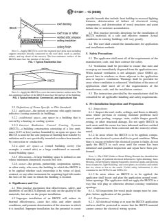 ASTM C1321-15(2020) is a standard published by ASTM International. Its full title is "Standard Practice for Installation and Use of Interior Radiation Control Coating Systems (IRCCS) in Building Construction". This standard covers: SIGNIFICANCE AND USE 4.1 This practice recognizes that effectiveness, safety, and durability of an IRCCS depends not only on the quality of the materials, but also on the proper installation. 4.2 Improper installation of an IRCCS will reduce its thermal effectiveness, cause fire risks and other unsafe conditions, and promote deterioration of the structure in which it is installed. Improper installation has the potential to create specific hazards that include: heat buildup in recessed lighting fixtures, deterioration of failure of electrical wiring components, and deterioration of wood structures and paint failure due to moisture accumulation. 4.3 This practice provides directions for the installation of IRCCS materials in a safe and effective manner. Actual conditions in existing buildings will vary greatly. 4.4 The user shall consult the manufacturer for application and installation methods. SCOPE 1.1 This practice has been prepared for use by the designer, specifier, and applicator of Interior Radiation Control Coating Systems (IRCCS) for use in building construction. The scope contains instructions related to the use and installation of IRCCS that are sprayed, rolled, or brush applied. Examples that this practice is intended to address include: (1) low emittance surfaces in vented building envelope cavities intended to retard radiant transfer across the vented airspace; (2) low emittance surfaces at interior building surfaces intended to retard radiant transfer to or from building inhabitants; and (3) low emittance surfaces at interior building surfaces intended to reduce radiant transfer to or from heating or cooling systems. FIG. 1 Typical Residential Use Note 1: Apply IRCCS to cover the exposed roof deck area including support structure directly connected to the roof deck (such as purlins, rafters, and top chord of the trusses). The low-emittance surface of the IRCCS must face the interior of the attic. FIG. 2 Typical Industrial, Commercial, and Agricultural Use Note 1: Apply the IRCCS to cover the entire interior surface area. The low-emittance surface of the IRCCS must face the interior of the building. 1.2 This practice covers the installation process from pre-installation inspection through post-installation. It does not cover the production of the Interior Radiation Control Coating Materials. 1.3 This practice is not intended to replace the manufacturer's installation instructions, but it shall be used in conjunction with such instructions. This practice is not intended to supersede local, state, or federal codes. 1.4 This practice assumes that the installer possesses a good working knowledge of the application codes and regulations, safety practices, tools, equipment, and methods necessary for the installation of Interior Coating Materials. It also assumes that the installer understands the fundamentals of building construction that affect the installation of an IRCCS. 1.5 When the installation or use of Interior Radiation Control Coating Materials, accessories, and systems pose safety or health problems, the manufacturer shall provide the user appropriate current information regarding any known problems associated with the intended use of the products and shall also provide direction on protective measures to be employed for safe utilization. The user shall establish appropriate safety and health practices and determine the applicability of regulatory requirements prior to use. 1.6 This standard does not purport to address all of the safety concerns, if any, associated with its use. It is the responsibility of the user of this standard to establish appropriate safety, health, and environmental practices and determine the applicability of regulatory limitations prior to use. Specific precautionary statements are contained in Sections 5 and 7. 1.7 This international standard was developed in accordance with internationally recognized principles on standardization...